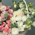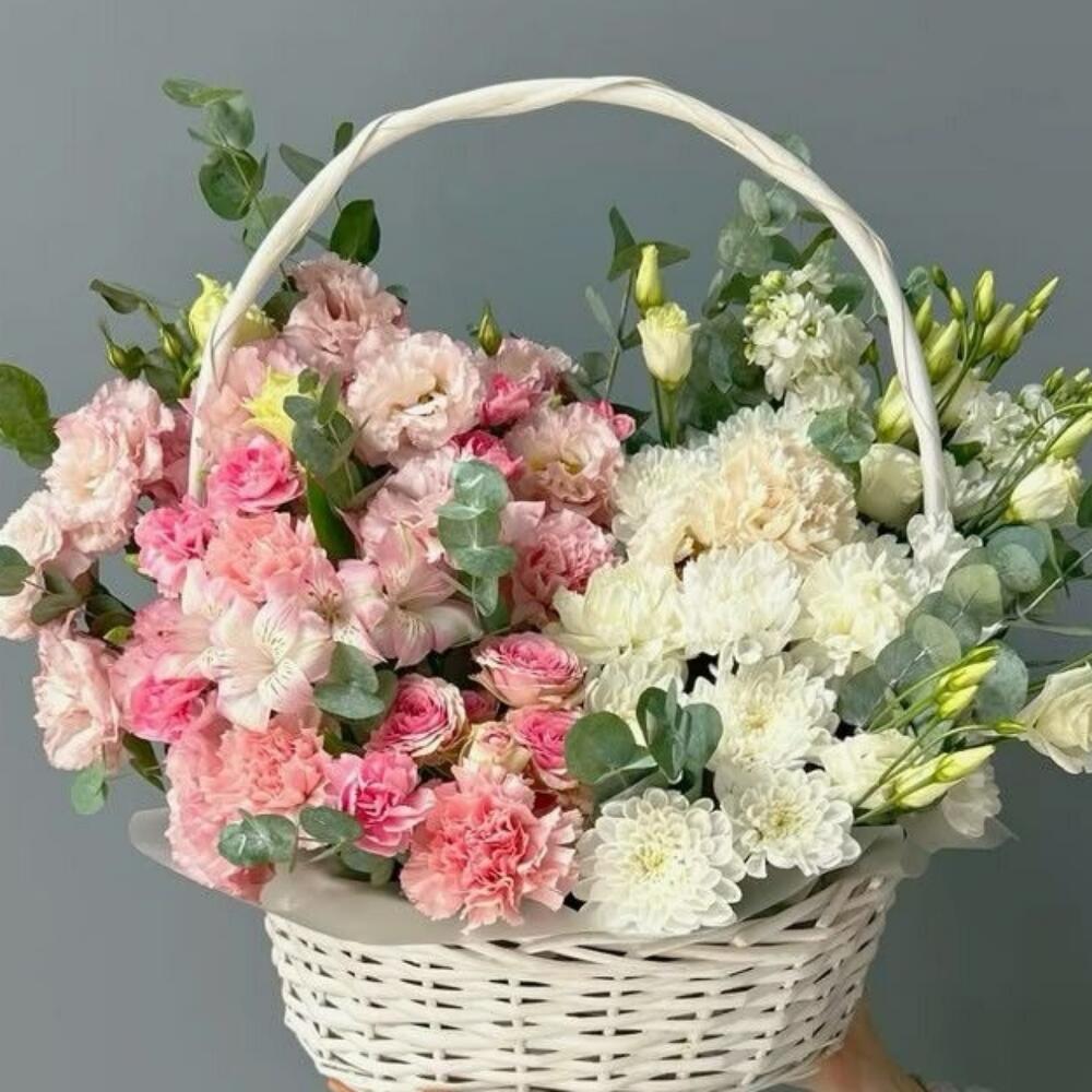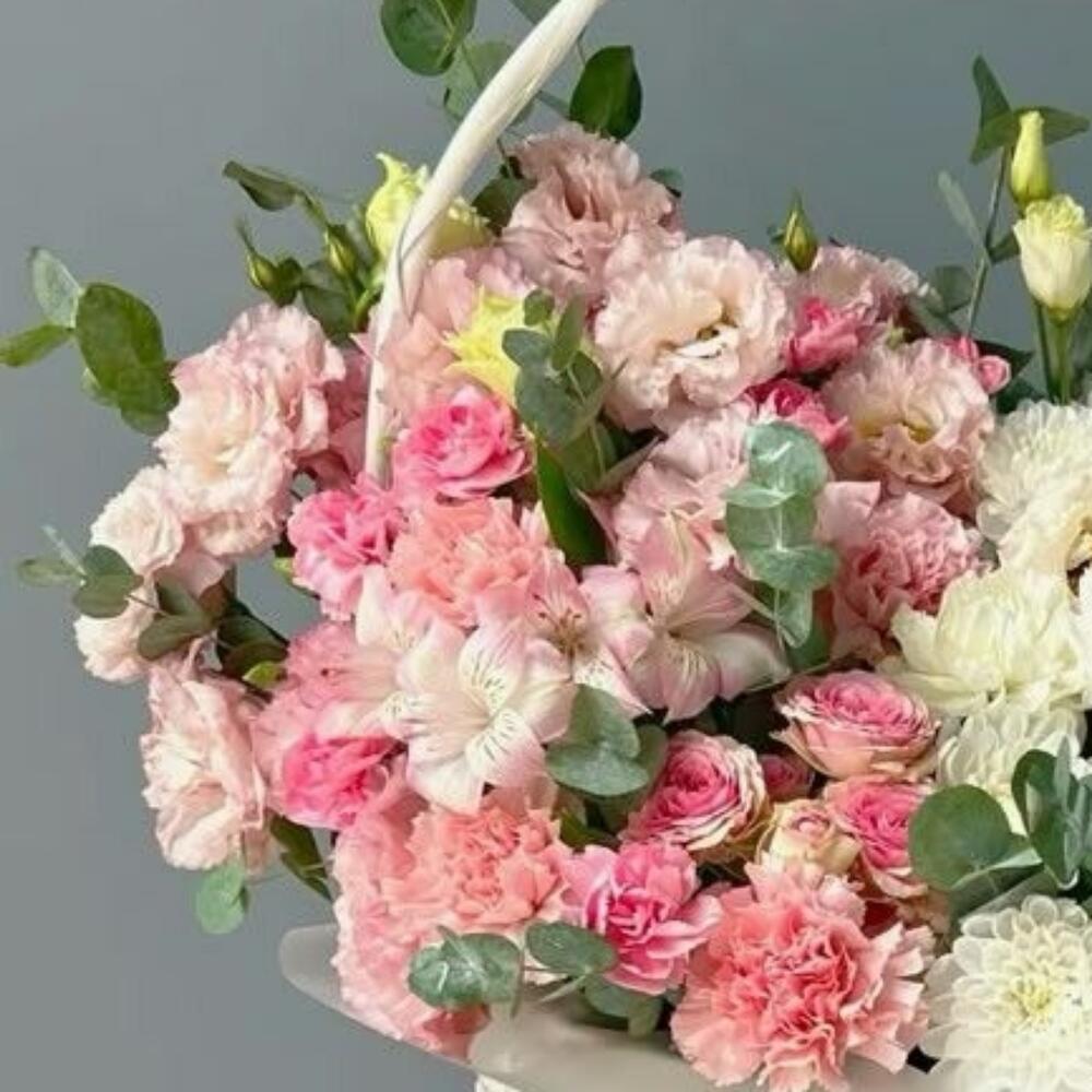 Eucalyptus - 10 pce Alstroemeria - 15 pce Basket - 1 pce Lisianthus - 10 pce œillets roses - 10 pce spray roses - 20 pce chrysanthème blanc - 15 pce