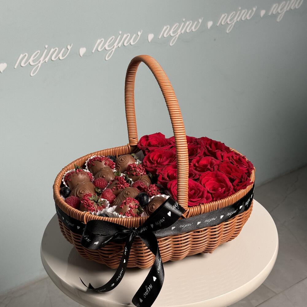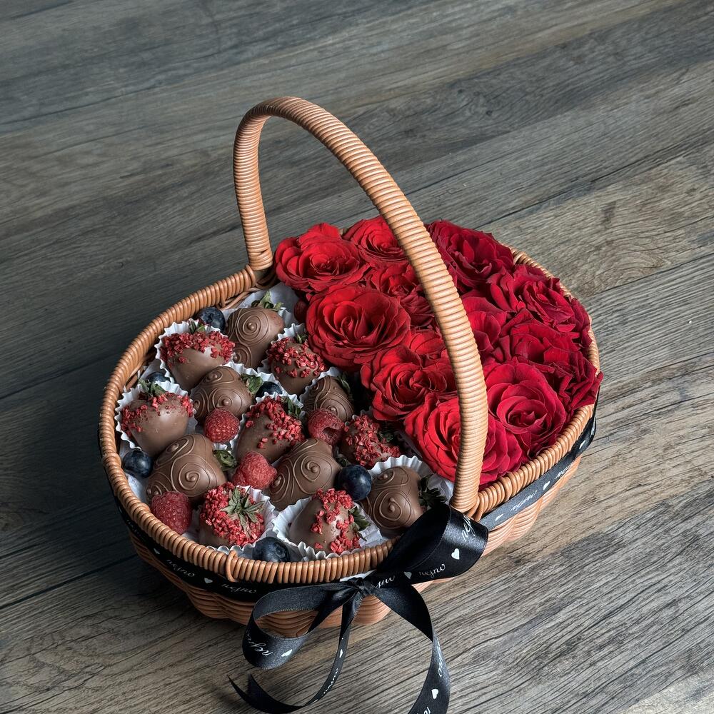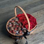 Chaque jour nous recevons des fraises fraîches, que nous tempérons dans le chocolat belge premium Calebaut. Nous ne préparons pas de produits à l'avance, toutes les compositions sont préparées après réception de la commande. Ingrédients: 10-15 fraises, myrtilles, chocolat belge, fleurs Emballage: Panier