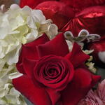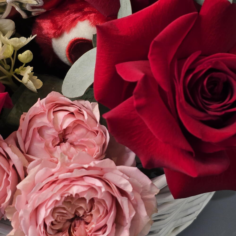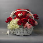 rose - 8 pce hortensia blanc - 1 pce julietta rose spray - 3 pce panier (petit) - 1 pce ours en peluche (rouge) - 1 pce