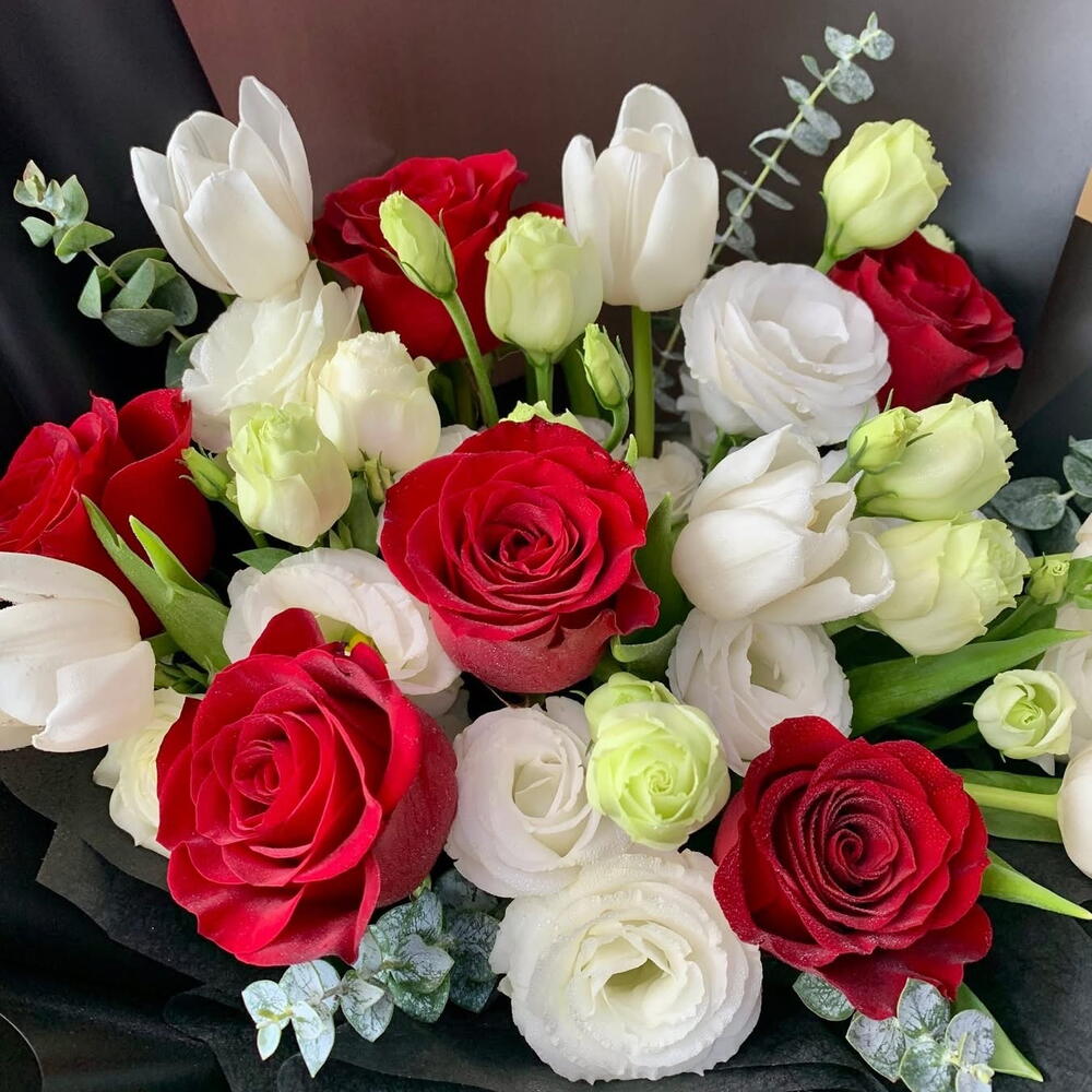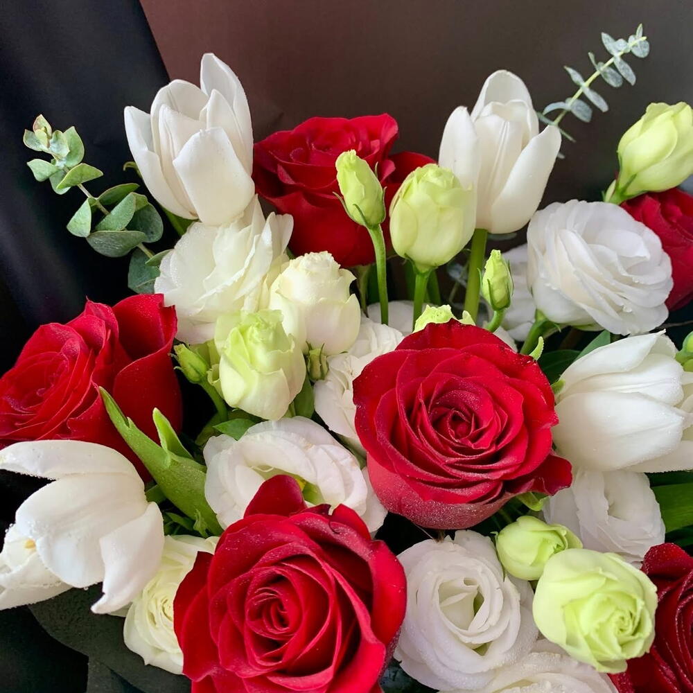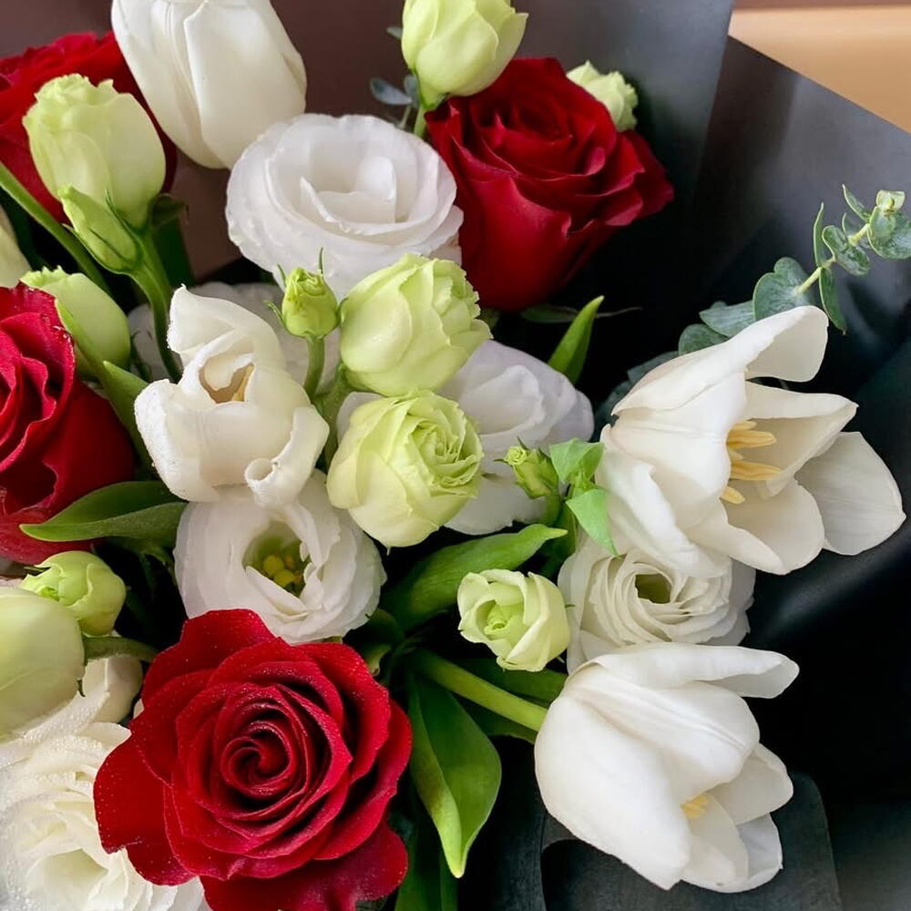 Red rose - 6 pce Lisianthus - 5 pce tulipes blanches - 5 pce