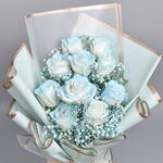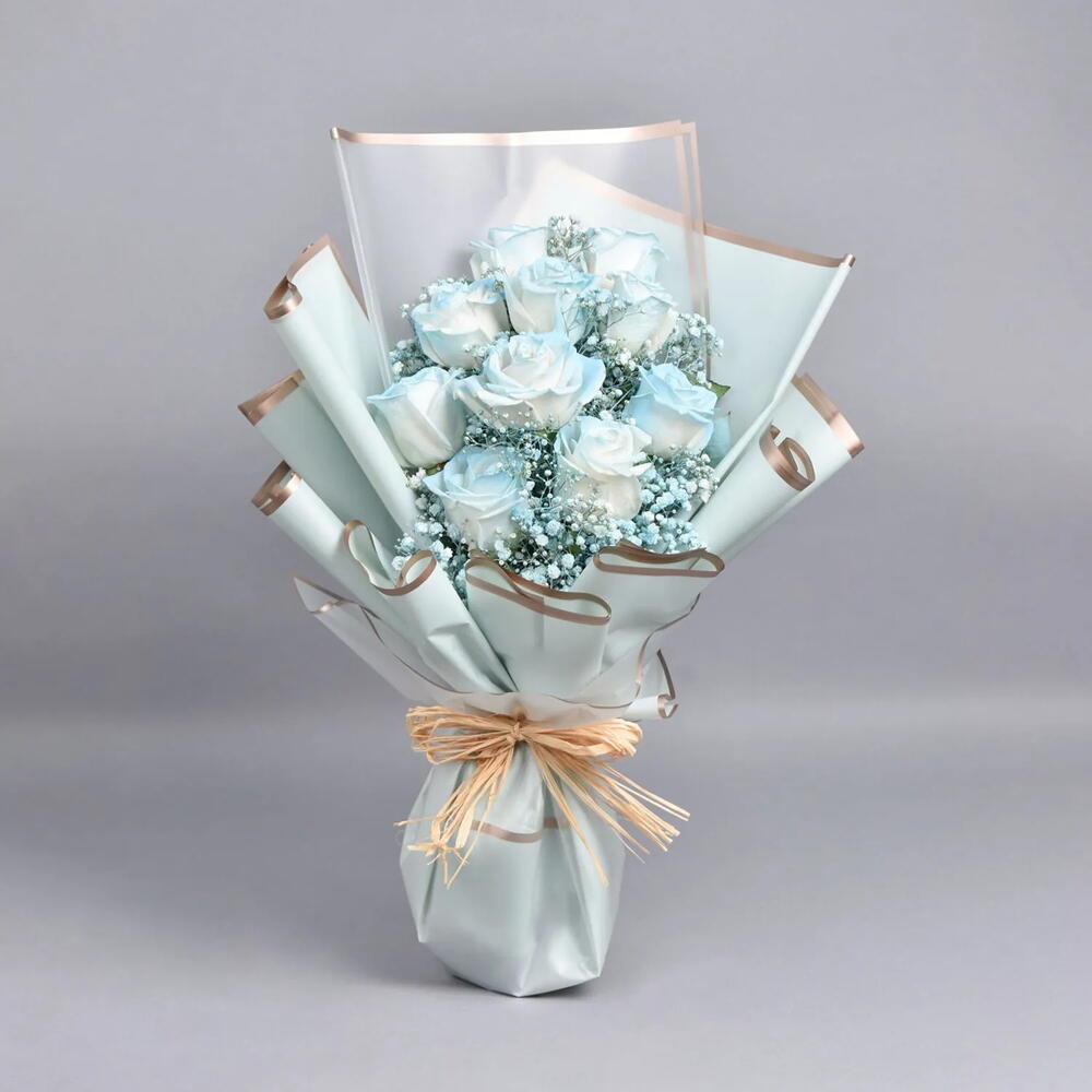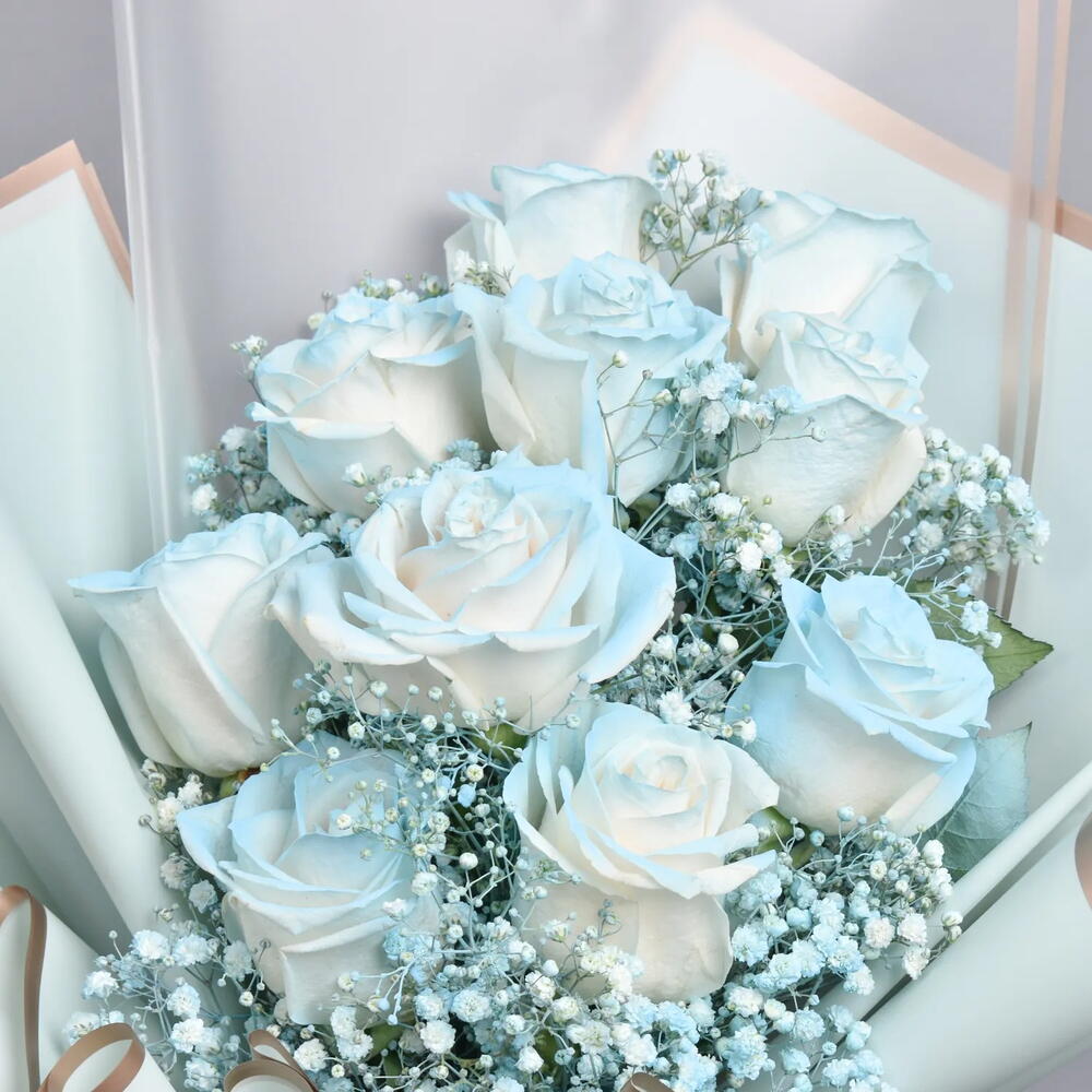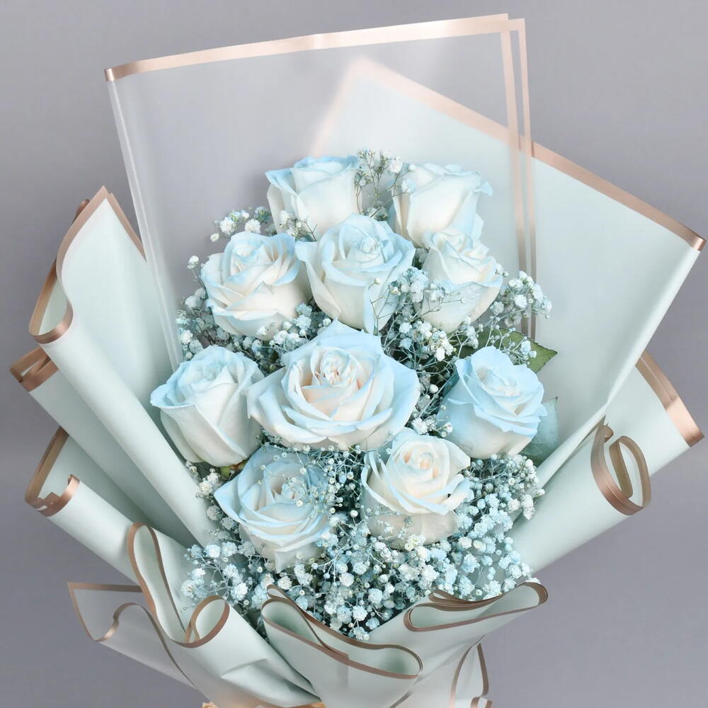 10 roses peintes en bleu clair 5 tiges de gypsophile Magnifiquement arrangées en bouquet