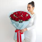 31 roses rouges, 3 tiges de gypsophile enveloppées dans un emballage bleu.