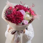 Peony pink - 2 pce hortensia rouge - 2 pce spray rose framboise - 3 pce protéa king blanc - 1 pce poussière de bouddha - 2 pce ruscus italien rose - 2 pce