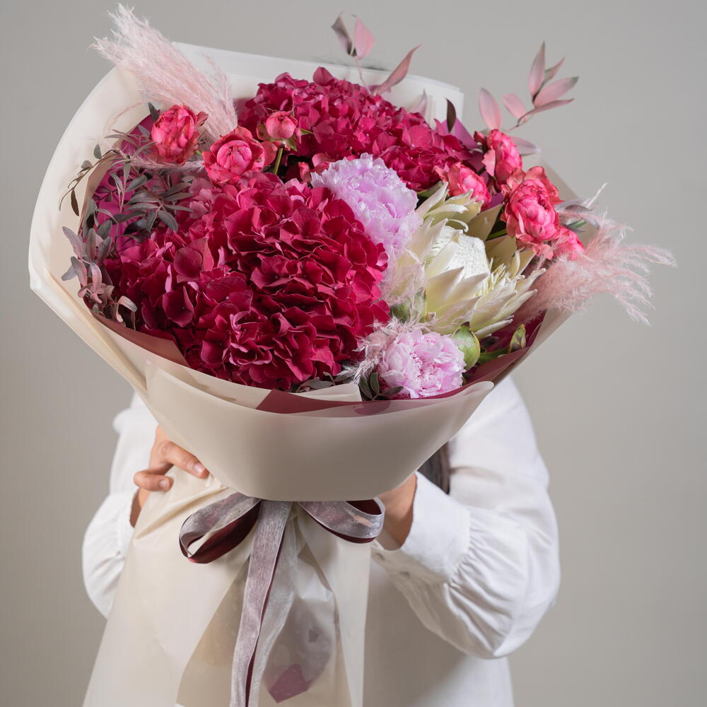 Peony pink - 2 pce hortensia rouge - 2 pce spray rose framboise - 3 pce protéa king blanc - 1 pce poussière de bouddha - 2 pce ruscus italien rose - 2 pce