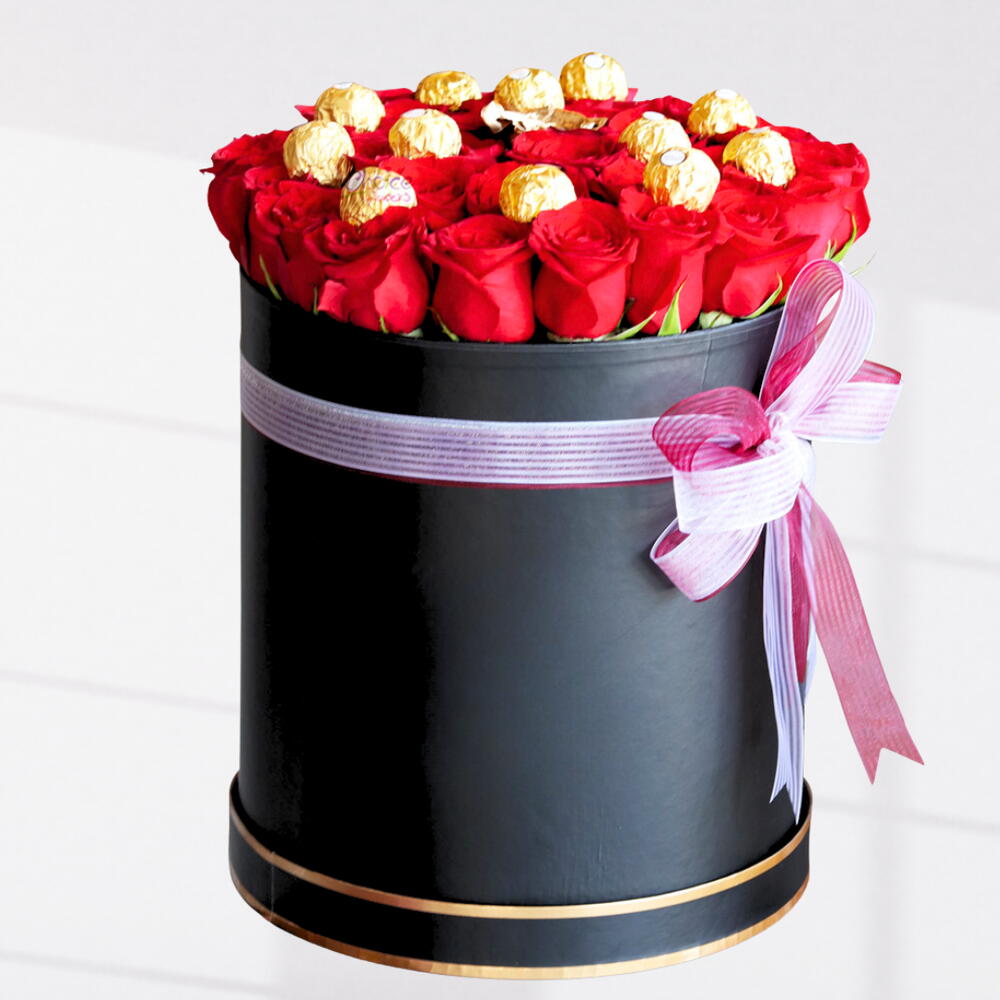25 roses rouges 12 Ferrero Boîte ronde noire