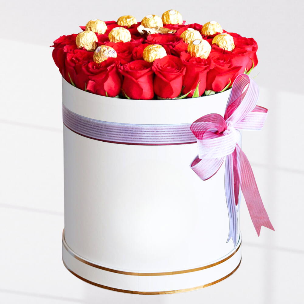 25 roses rouges 11 Ferrero Boîte ronde blanche