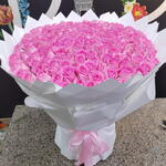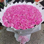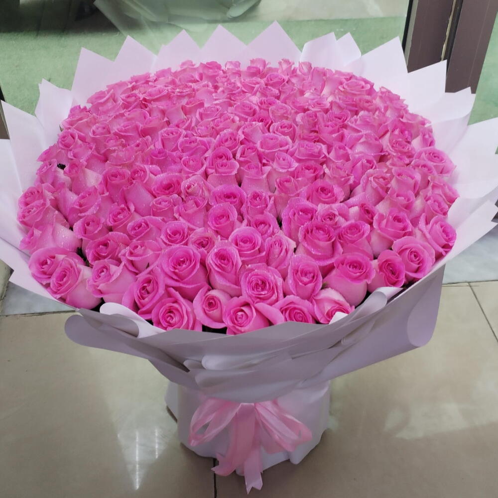 Un superbe bouquet de 160 roses roses, élégamment enveloppé dans du blanc, parfait pour les occasions spéciales ou comme cadeau sincère.