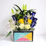 Rendez les anniversaires encore plus spéciaux avec le coffret cadeau « Sac d'anniversaire » avec fleurs mélangées, chocolats et ballons aluminium : une surprise joyeuse, pleine de joie, d'élégance et de gourmandises. Cette ravissante composition est composée de lys frais, de roses et de garnitures luxuriantes, le tout dans un charmant sac sur le thème des anniversaires. Accompagné de tablettes de chocolat Cadbury Dairy Milk et d'un ballon aluminium « Joyeux Anniversaire » éclatant, ce cadeau ravira les plus petits. Idéal pour surprendre vos proches, petits et grands, cet ensemble attentionné est une façon chaleureuse de souhaiter un joyeux anniversaire avec style. Conseils d'entretien : Conservez les fleurs dans un endroit frais, à l'abri de la lumière directe du soleil et des courants d'air. Les chocolats doivent être conservés dans un endroit ombragé et frais. Le ballon aluminium reste gonflé pendant 6 à 8 heures selon la température ambiante. Vaporisez légèrement le bouquet quotidiennement pour préserver sa fraîcheur.
