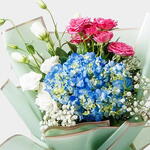 Un mélange chaleureux d'hortensias bleus, de lisianthus blancs et de roses roses. Soigneusement emballé avec un ruban, il transmettra votre amour et votre affection de la plus belle des manières.