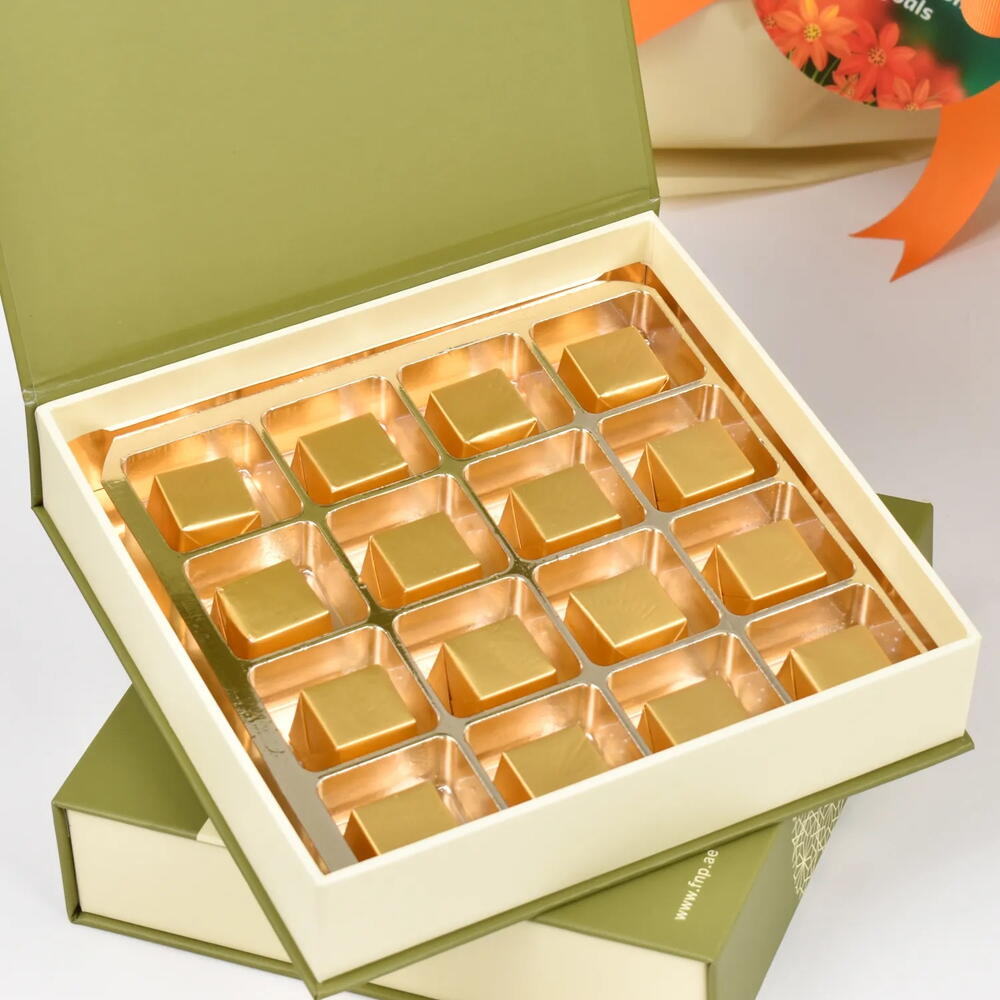 3 Roses jaunes 2 Chrysanthèmes jaunes 3 Buplérums jaunes 3 Lys orange 1 Chrysanthème orange 2 Roses spray pêche Magnifiquement emballé et noué avec un ruban Chocolats assortis Quantité- 16 pièces Présenté dans une boîte de marque Fnp