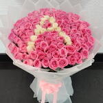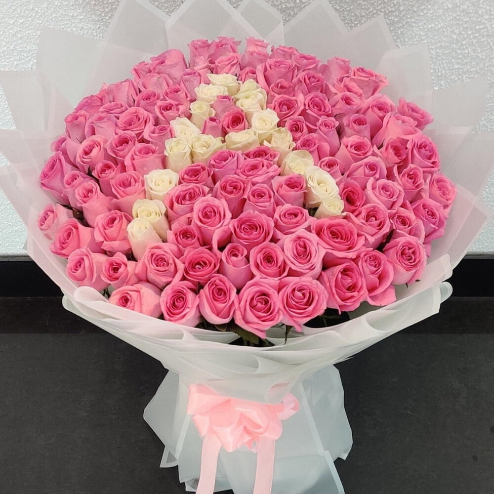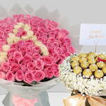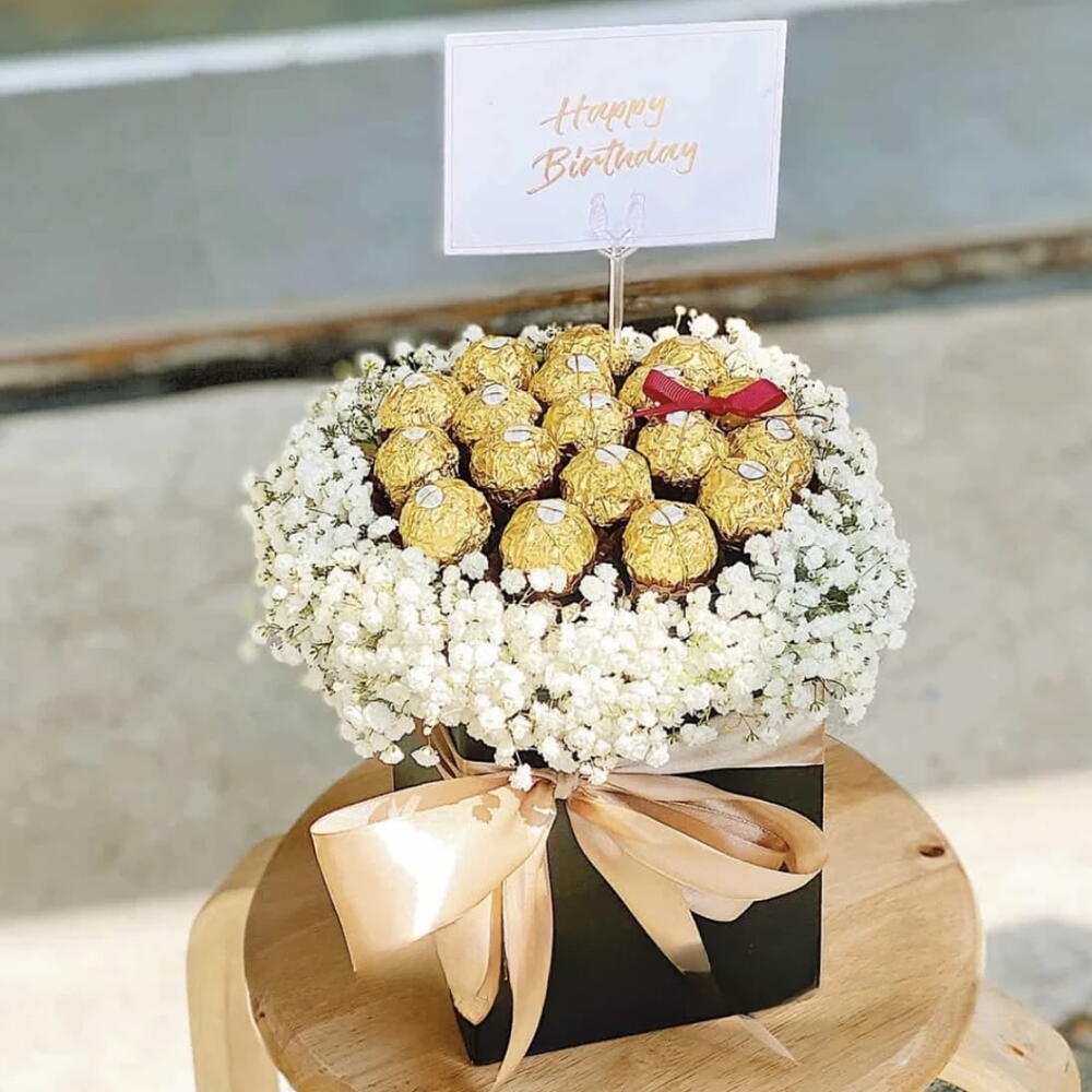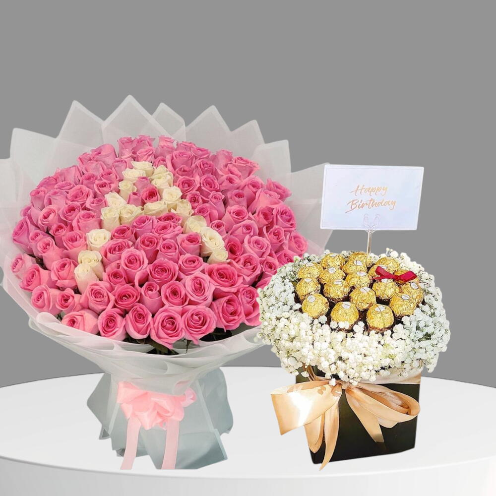 Grand bouquet de roses : un grand bouquet, noué à la main, est présenté à gauche. Il se compose d'environ une centaine de roses roses, des roses blanches étant disposées pour former une lettre, probablement un A, au centre. Le bouquet est enveloppé dans du papier blanc et attaché avec un ruban rose pâle. Composition de chocolats et de fleurs : à droite, une boîte carrée noire contient une composition de fleurs d'appoint blanches, comme la gypsophile, entourant des chocolats enveloppés dans du papier doré, en l'occurrence des Ferrero Rocher. Une petite carte portant l'inscription « Happy Birthday » est fixée à cette composition.