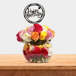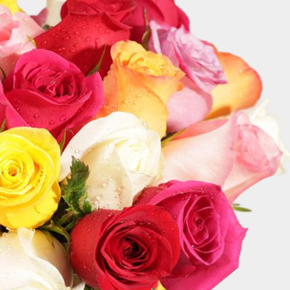 Célébrez leur journée spéciale en couleurs avec cette composition vibrante de roses mélangées dans des nuances de violet, rouge, jaune, orange, fuchsia, blanc et rose pâle chaque fleur ajoutant sa propre note joyeuse à la célébration.