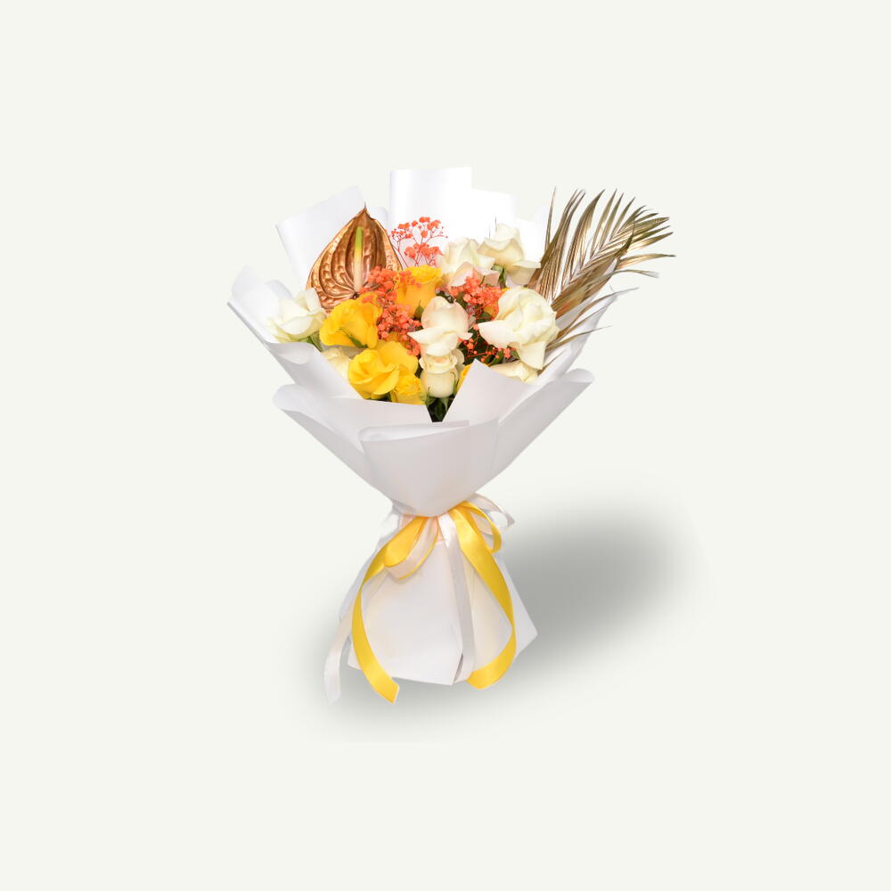 Bouquet lié à la main avec un mélange éclatant de 15 roses jaunes et blanches, de gypsophile orange, d'anthurium doré et de feuilles d'aréca, magnifiquement confectionné dans un emballage blanc immaculé, parfait pour des célébrations lumineuses et joyeuses.