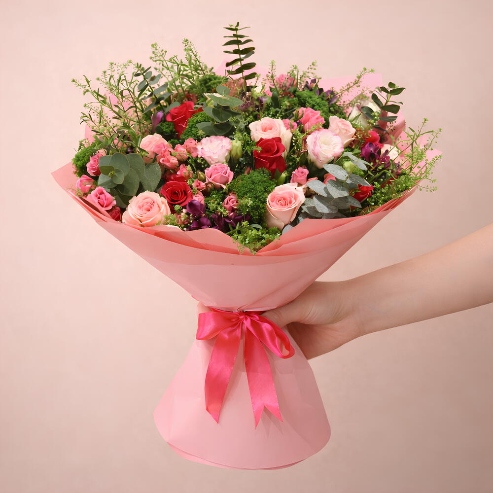 Eucalyptus - 4 pce viorne verte - 4 pce roses - 25 pce purple spray flowers - 4 pce