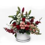Red rose - 5 pce rose branchue rose - 5 pce baby breath - 2 pce orchidée blanche - 2 pce matthiola blanche - 3 pce sauvetages - 3 pce lys oriental rose - 3 pce orchidée rouge (mokara) - 5 pce