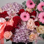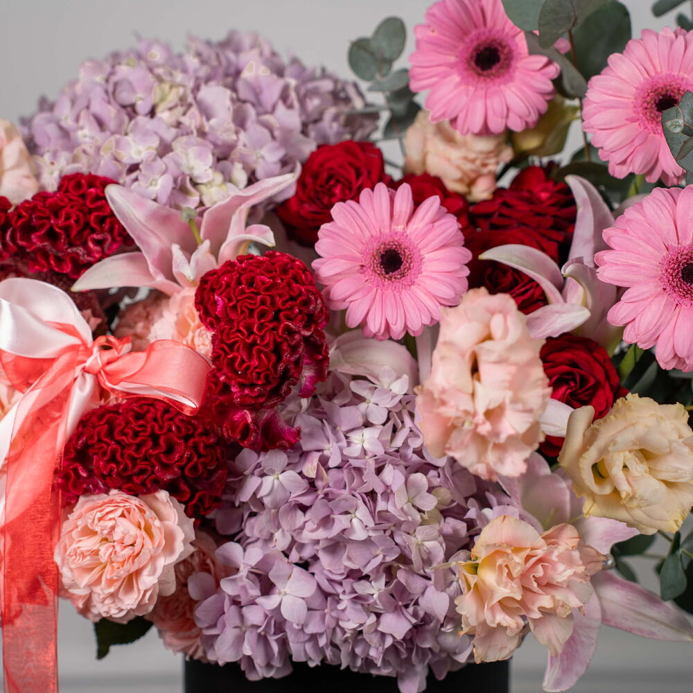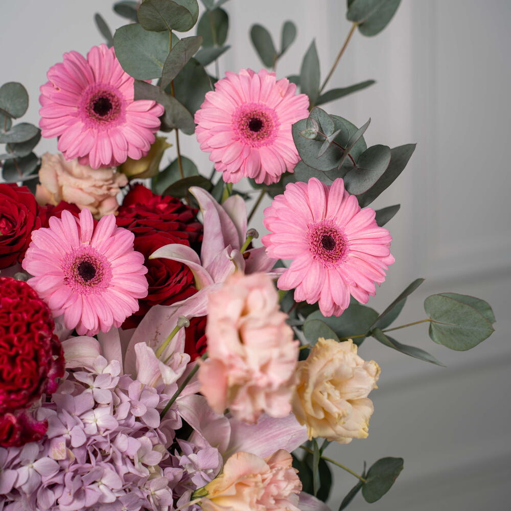 Eucalyptus - 3 pce eustoma pêche - 3 pce germini rose - 4 pce lys rose - 3 pce spray de roses rouges - 3 pce célosie rouge - 3 pce hortensia violet clair - 2 pce spray de roses jullieta rose - 6 pce