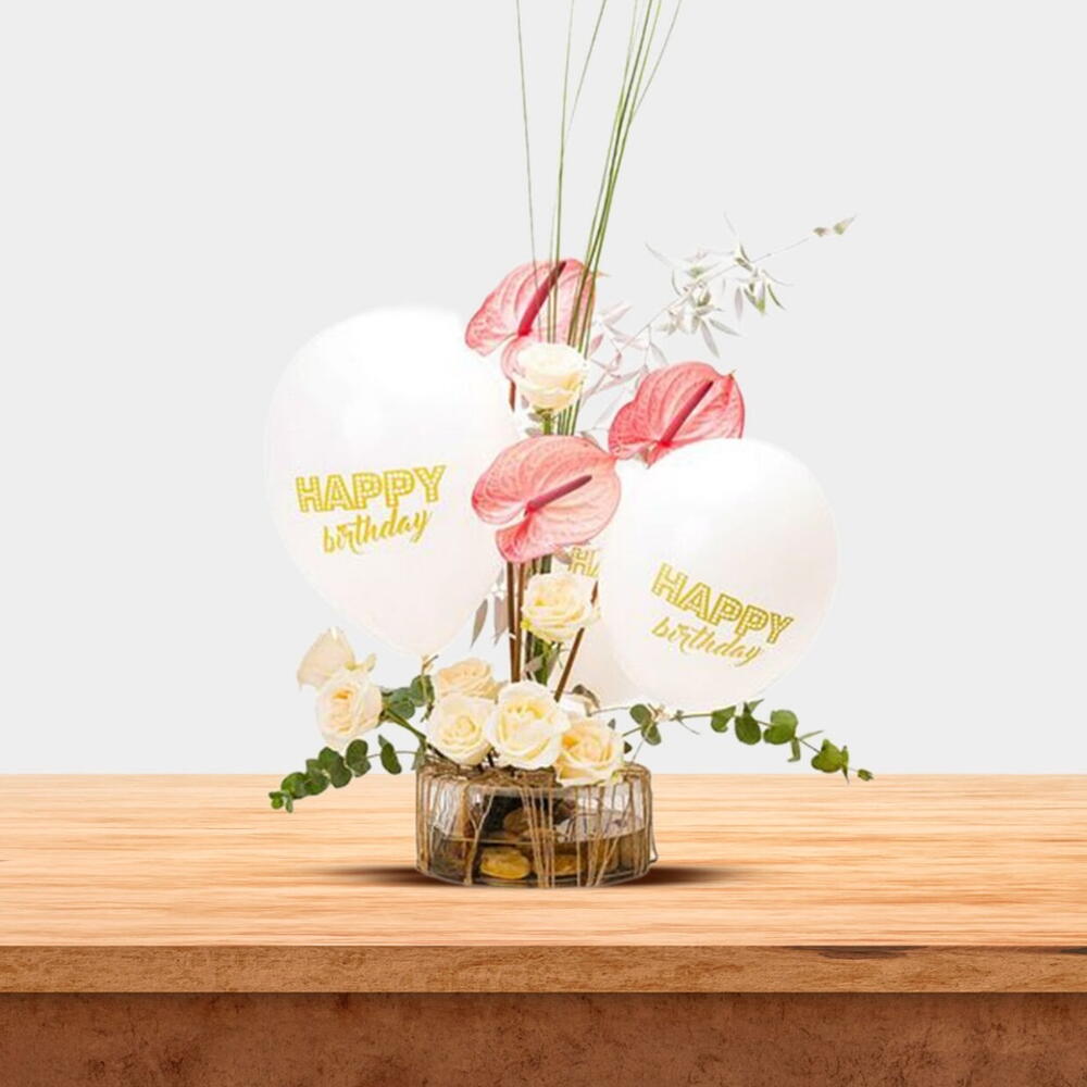 Célébrez leur journée spéciale avec une composition florale soigneusement réalisée à la main, conçue avec amour par notre fleuriste et présentée dans un élégant vase en verre. Débordant de fleurs fraîches et éclatantes, ce charmant bouquet est une expression joyeuse d'amour, d'attention et de célébration. Parfait pour offrir à un être cher. C'est une belle façon de laisser les fleurs parler pour vous et de rendre leur anniversaire vraiment mémorable.
