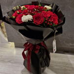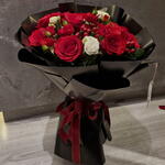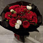 Red rose - 9 pce œillet rouge - 5 pce mini-rose blanche - 8 pce emballage noir - 1 pce baies d'hypericum - 4 pce feuillages verts - 2 pce accessoires - 1 pce