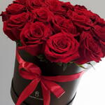 Ce cadeau romantique et élégant présente 25 roses rouges vibrantes, disposées avec art dans une boîte cylindrique en forme de cœur sophistiquée, à la finition mate d'un brun foncé/noir riche, rehaussée d'un luxueux ruban en satin rouge noué. Le logo de la marque BLOOMS CULTURE est subtilement imprimé sur le côté, ajoutant une touche premium.