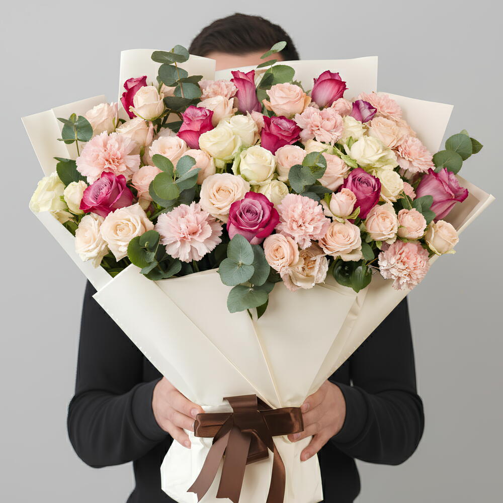 Ribbon - 1 pce Eucalyptus - 6 pce Wrapping - 10 pce rose branchue rose - 10 pce rose violette - 12 pce white spray rose - 10 pce pink carnation - 7 pce
