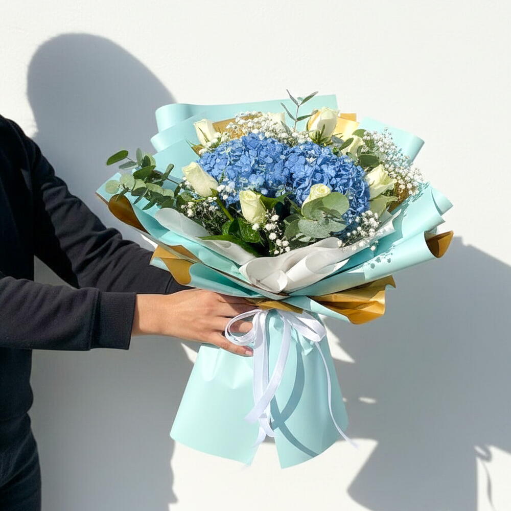 Une vision de beauté sereine et d'élégance raffinée : ce bouquet bleu et blanc allie la grâce intemporelle de 15 roses blanches fraîches aux teintes riches et romantiques de 2 hortensias bleus de qualité supérieure. Magnifiquement noué à la main dans un élégant papier bleu, ce bouquet symbolise la paix, l'admiration et les sentiments les plus profonds. C'est le choix idéal pour les anniversaires, les fêtes, les remises de diplômes ou pour exprimer votre amour et votre reconnaissance. Chaque fleur est soigneusement sélectionnée pour sa fraîcheur et sa perfection, créant un chef-d'œuvre floral qui rayonne d'harmonie, de pureté et de sophistication. ✨ Détails : ✓ 15 roses blanches fraîches ✓ 2 hortensias bleus ✓ Emballé à la main avec soin dans du papier bleu de qualité supérieure ✓ Symbolise la pureté, le calme et l'admiration ✓ Parfait pour les anniversaires, les déclarations d'amour ou les félicitations ✓ Livraison le jour même disponible à Dubaï JVC Offrez élégance et sérénité – commandez votre bouquet bleu et blanc dès aujourd'hui ! « Exprimez la beauté sereine et l'émotion pure — offrez-vous ce bouquet de luxe dès maintenant ! » « Célébrez chaque instant avec une élégance intemporelle en bleu et blanc — commandez dès aujourd'hui ! »