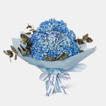 Le bouquet Blue Hydrangea présente des hortensias bleus frais et éclatants, magnifiquement arrangés avec de l'eucalyptus doré.