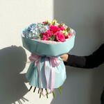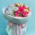 Ribbon - 1 pce Wrapping - 5 pce white spray rose - 4 pce hortensia bleu - 1 pce giselle pivoine roses - 4 pce