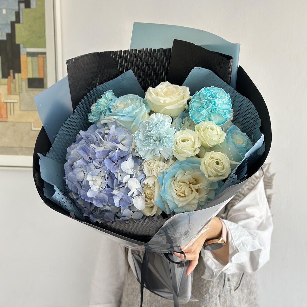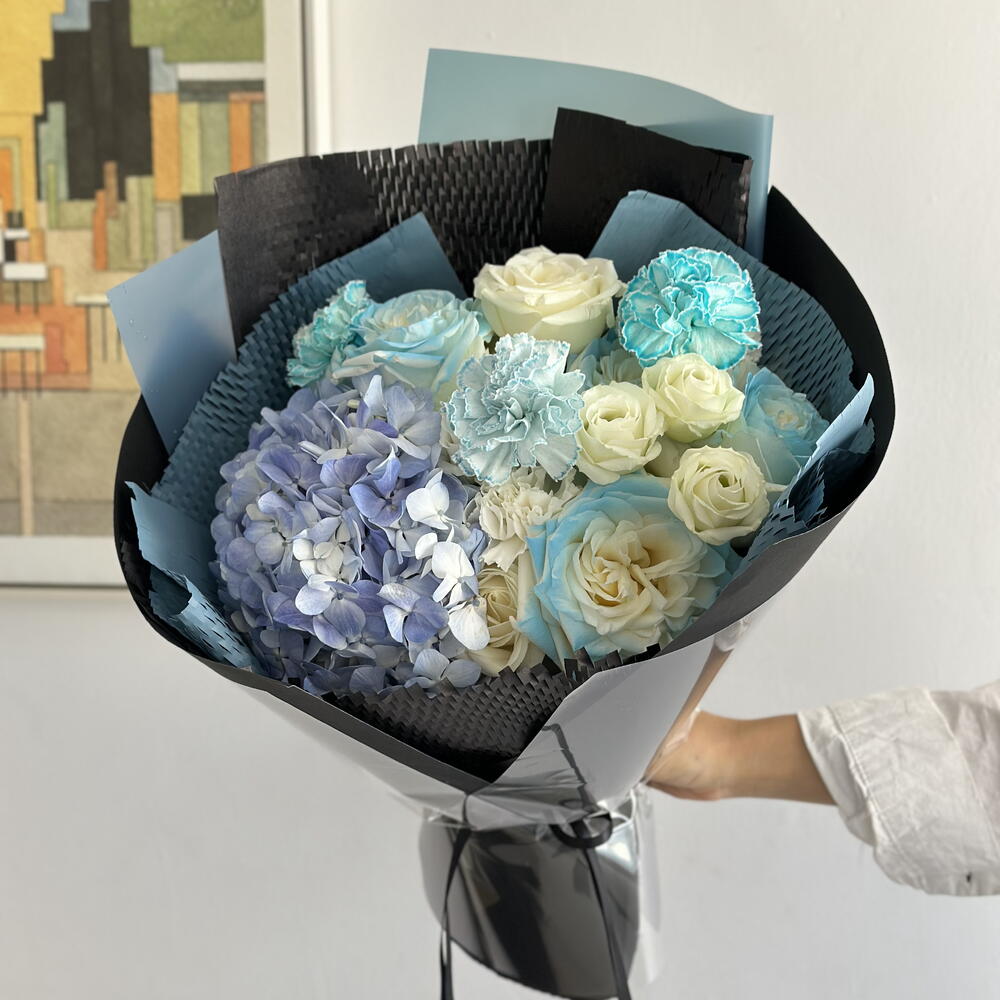 Eustoma - 1 pce White rose - 5 pce œillets - 3 pce hortensia bleu - 1 pce