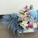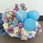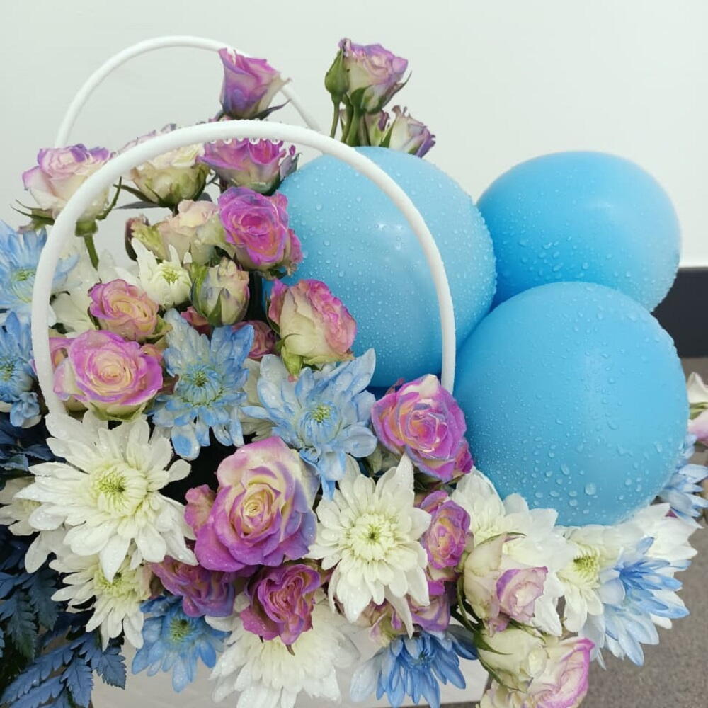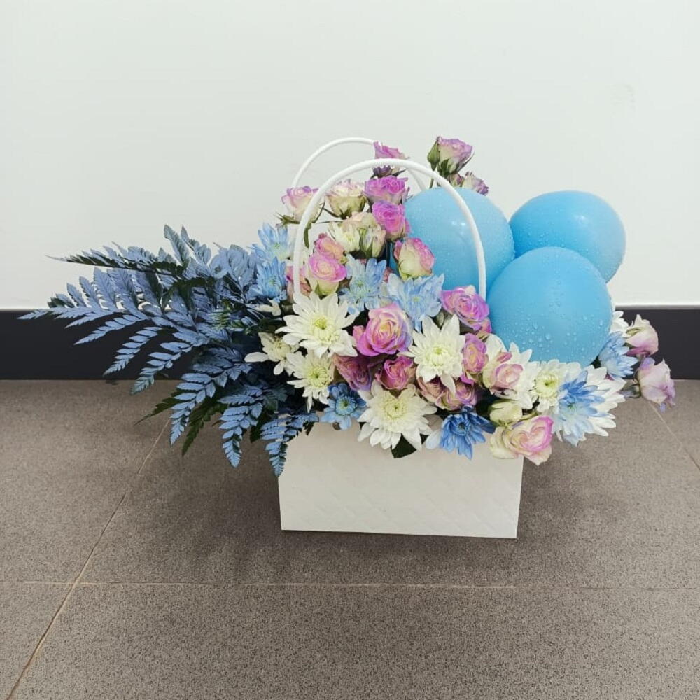 Une composition fantaisiste en sac, présentant un mélange vivant de fleurs blanches, roses et bleu pâle, accentuée de façon spectaculaire par des ballons teints en bleu pour une touche festive.