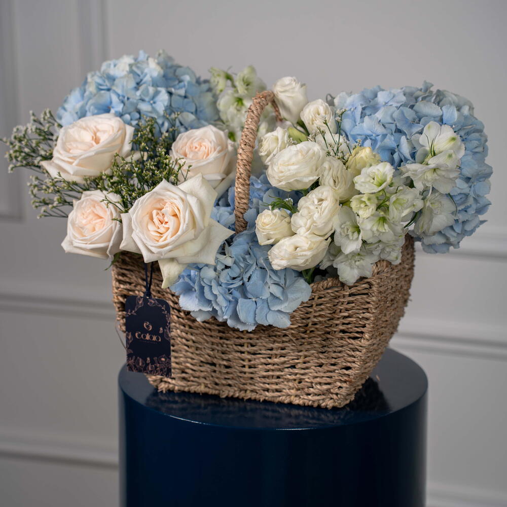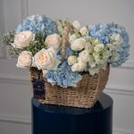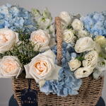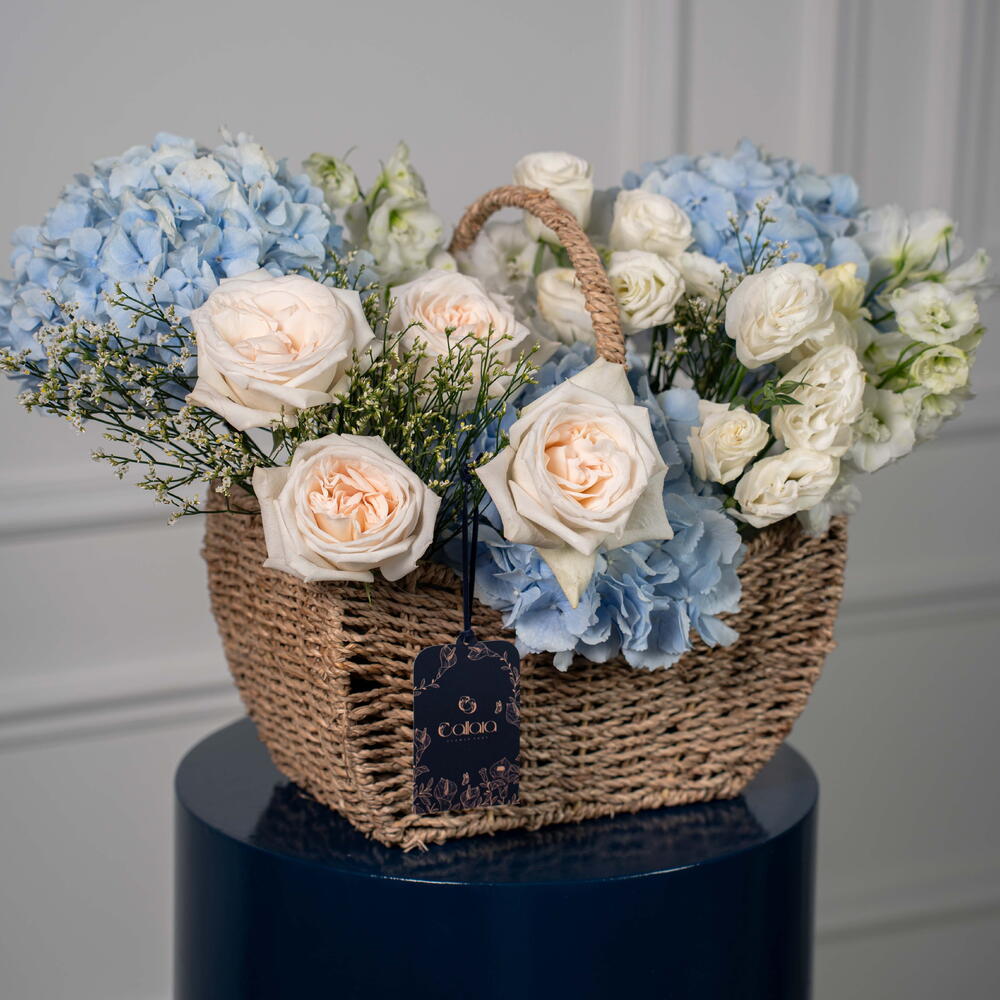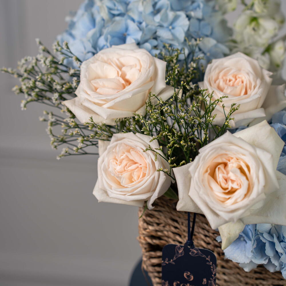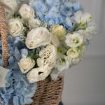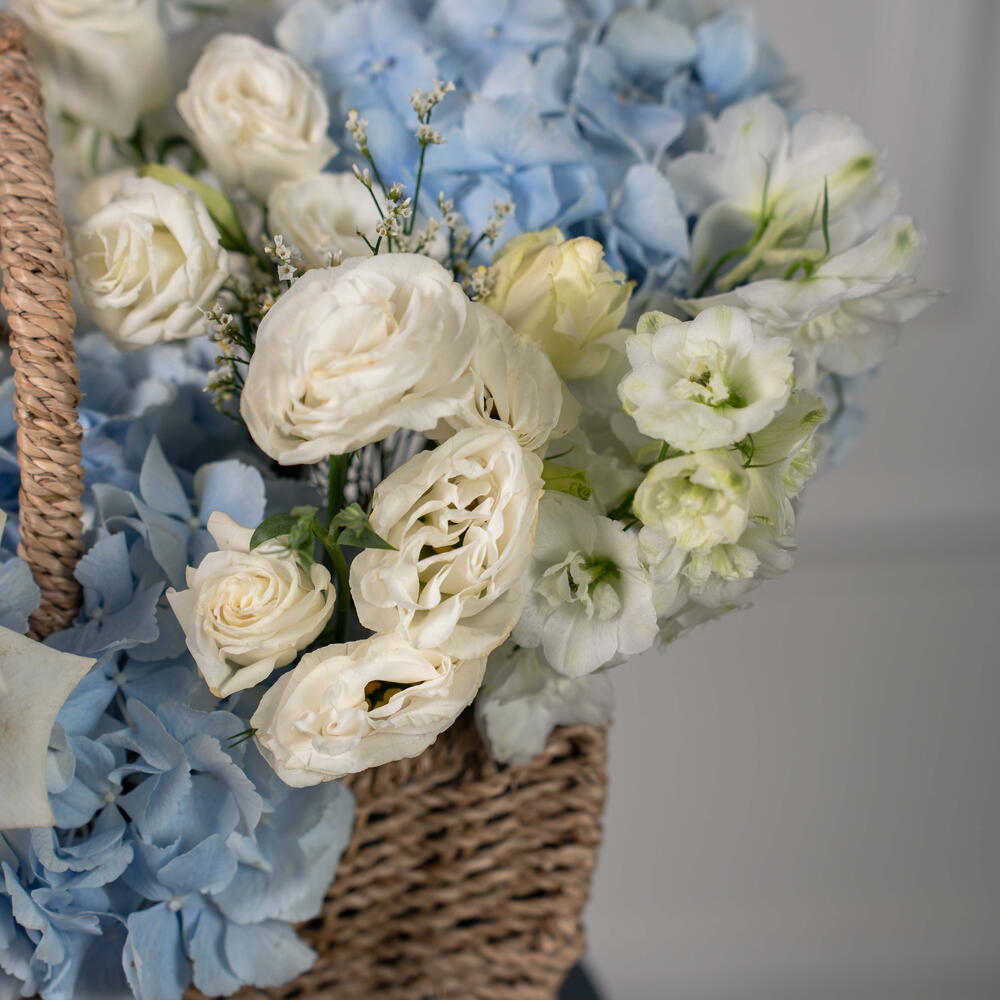 Eucalyptus - 1 pce Eustoma white - 3 pce delphinium blanc - 1 pce limonium blanc - 1 pce ohara blanc - 4 pce hortensia bleu ciel - 3 pce