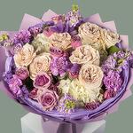 Hydrangea - 2 pce Wrapping - 1 pce carnation - 5 pce matthiola - 4 pce feuille de pistacia - 3 pce botte de lagurus séchés violets clairs - 8 pce roses menthe 50 ecu - 7 pce rose rossignol 50 clé - 5 pce spray de roses ciel violet - 4 pce