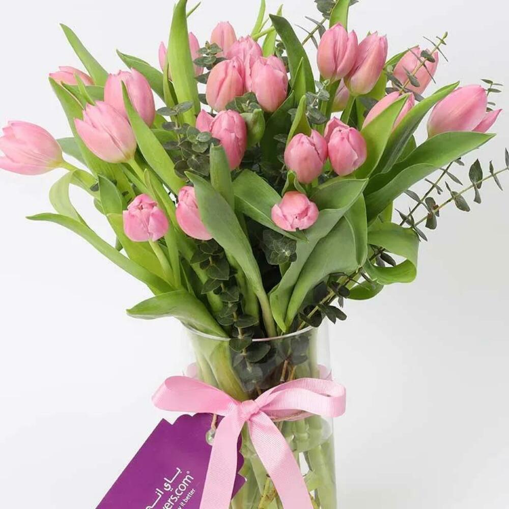 tulipes roses - 21 pce tiges d'eucalyptus - 3 pce vase cylindrique et attaché par un nœud de ruban rose pâle - 1 pce