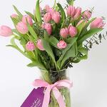 21 tulipes roses 3 tiges d'eucalyptus Dans un vase cylindrique Nœud en ruban rose clair