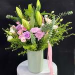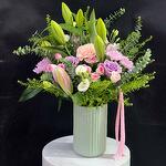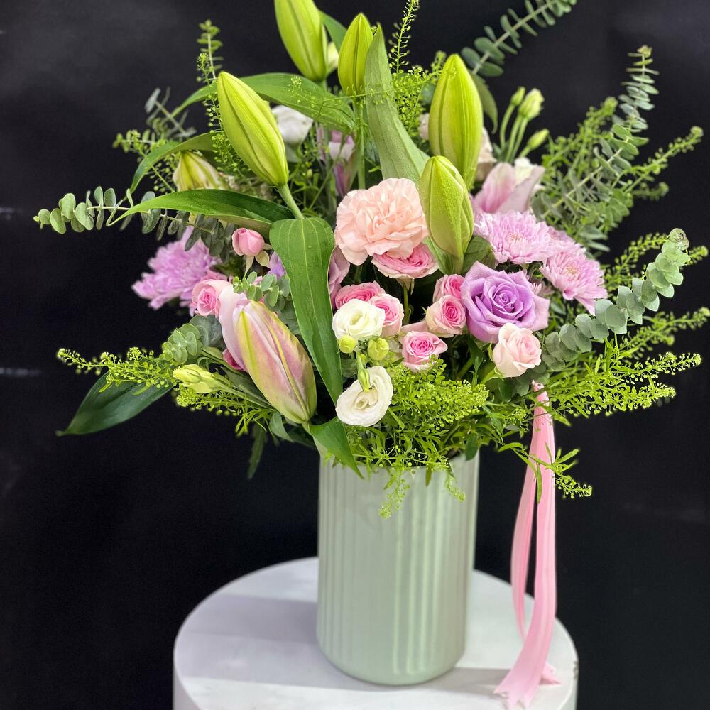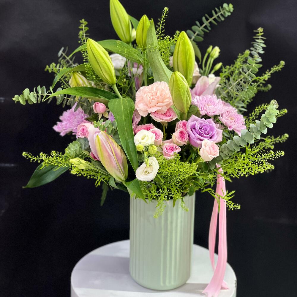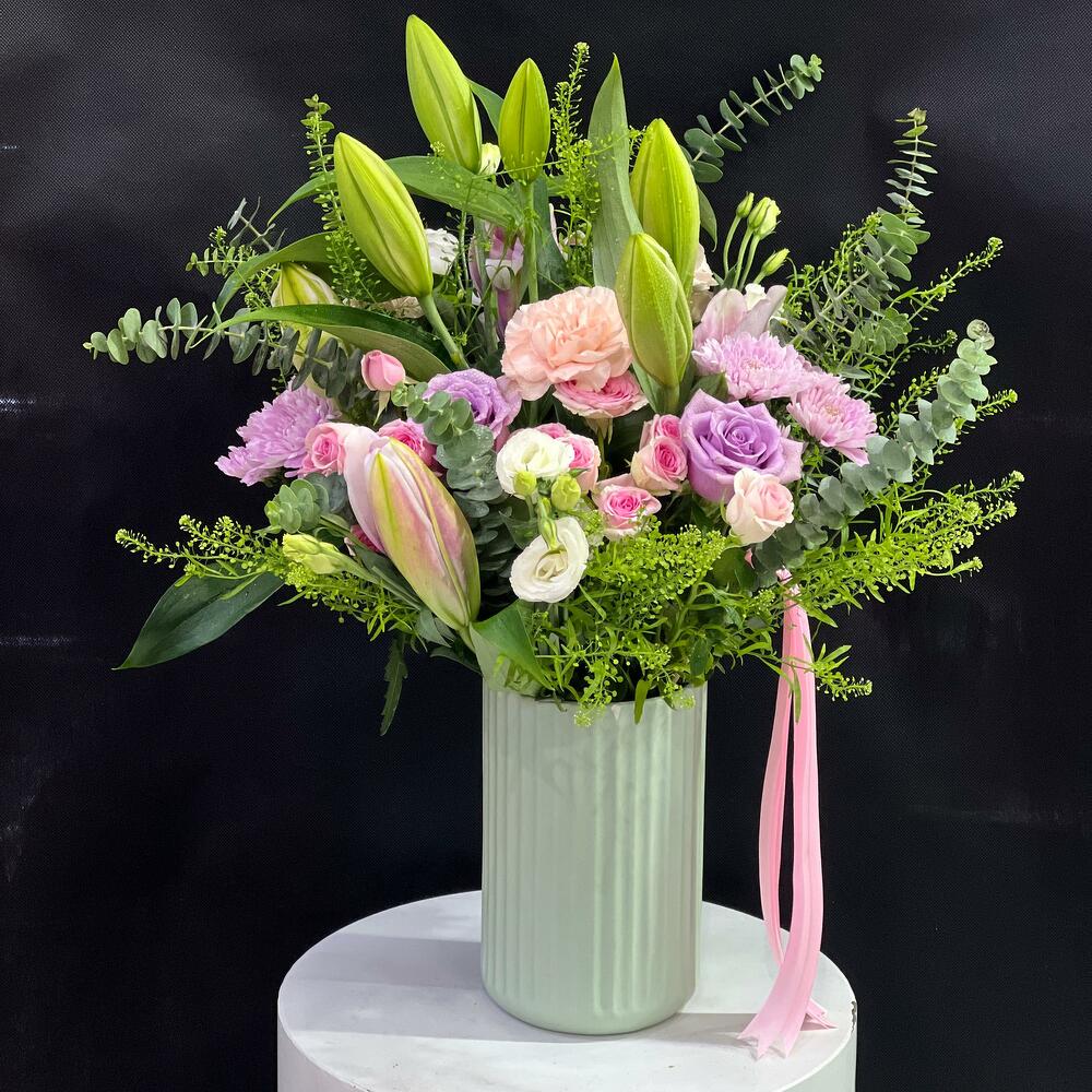 Eustoma - 3 pce Eucalyptus - 3 pce Chrysanthemum - 3 pce Vase - 1 pce lilly - 3 pce spray roses - 4 pce roses roses - 5 pce lipidiyum - 3 pce
