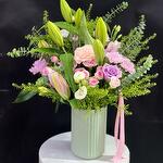 Une élégante composition en vase mettant en scène des fleurs roses fraîches parfaitement complétées par un feuillage luxuriant. Les doux tons rosés apportent charme et élégance, tandis que les verts naturels ajoutent fraîcheur et équilibre. Parfaite pour égayer n'importe quel espace, célébrer des moments spéciaux ou comme un cadeau attentionné témoignant d'amour et de reconnaissance.
