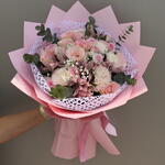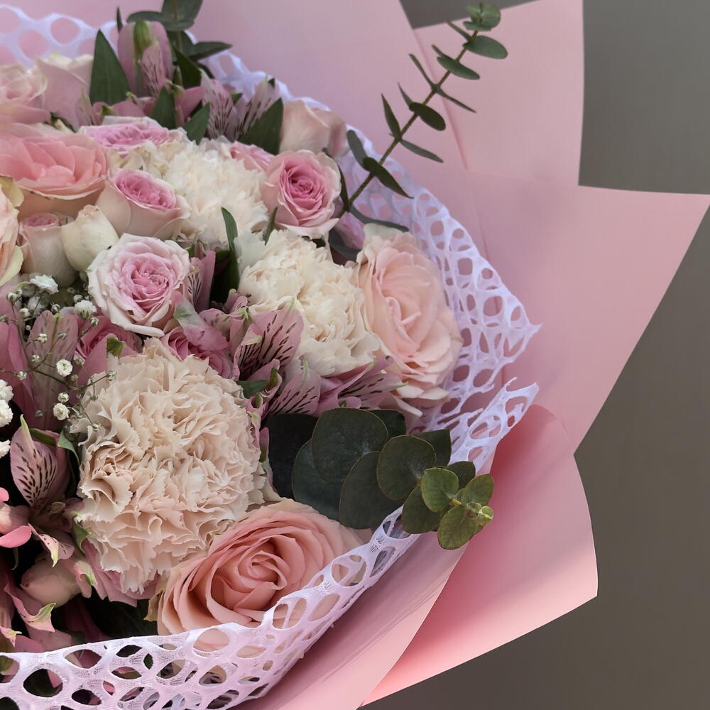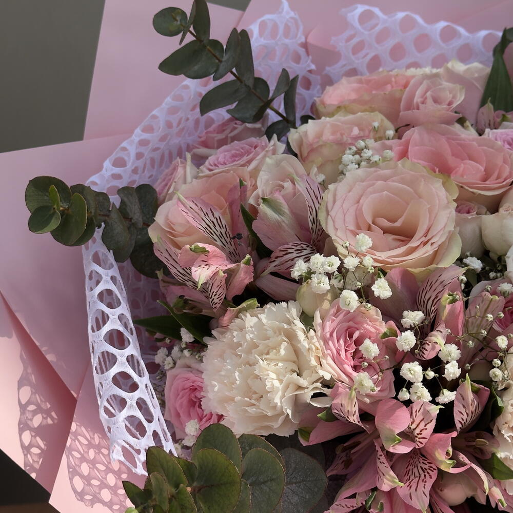A beautifully balanced arrangement featuring 7 Esperance pink roses, 4 pink spray roses, 5 soft pink carnations, and 4 delicate pink alstroemeria, complemented with fresh eucalyptus. This bouquet blends texture and tone in perfect harmony, creating a soft, romantic look that expresses admiration, grace, and warmth.