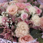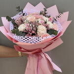 Eucalyptus - 3 pce pink alstroemeria - 4 pce roses branchues roses - 6 pce esperance roses roses - 7 pce œillets rose pâle - 5 pce