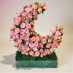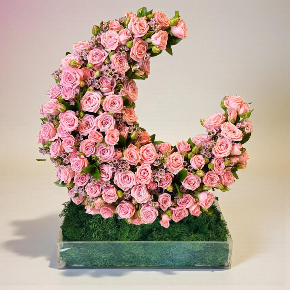Un chef-d'œuvre grandiose et sculptural présentant un immense croissant de lune méticuleusement façonné entièrement à partir de centaines de roses spray d'un rose pâle. La texture dense et veloutée des fleurs est rehaussée par de minuscules waxflowers violettes, créant une tapisserie florale riche et homogène. L'ensemble du croissant repose sur un lit de mousse verte luxuriante au sein d'une base en acrylique transparente, en faisant une pièce maîtresse sophistiquée et haut de gamme pour les célébrations et les intérieurs de luxe.