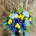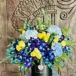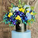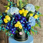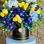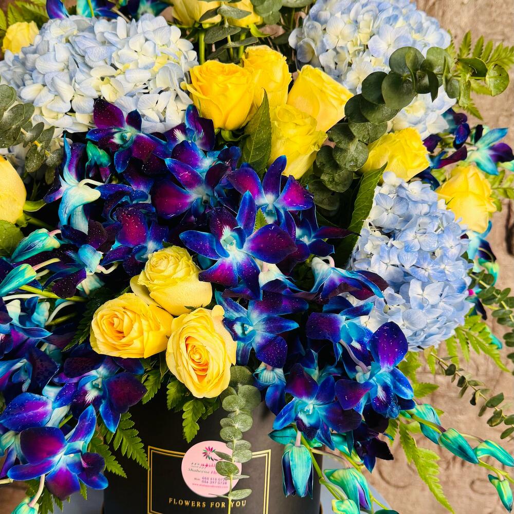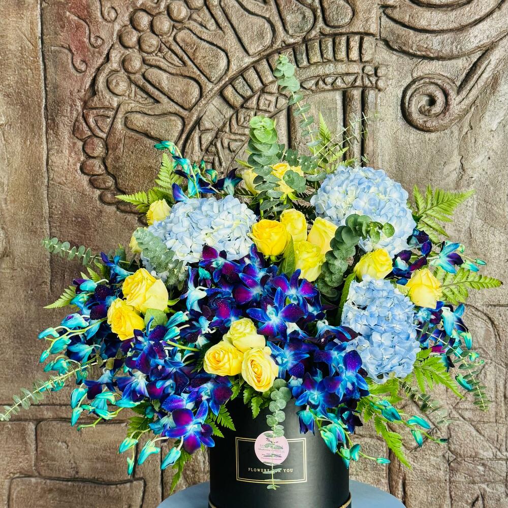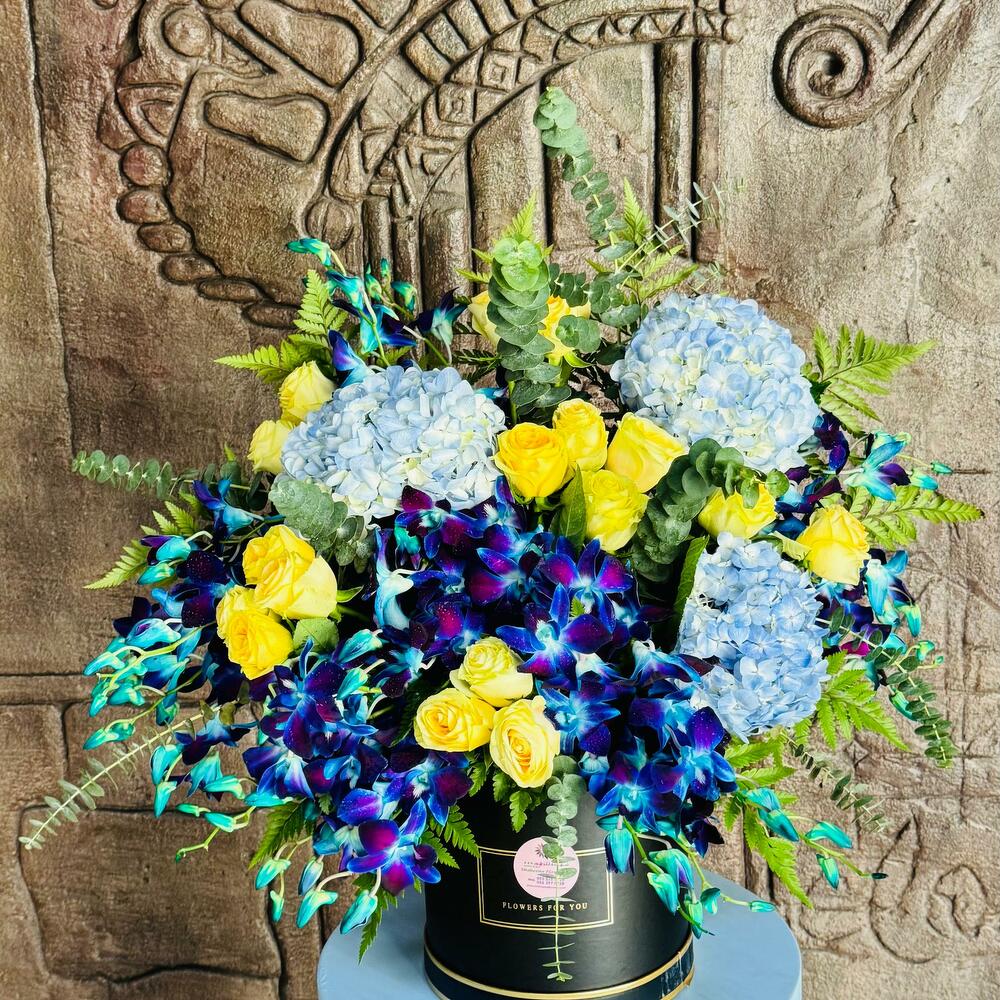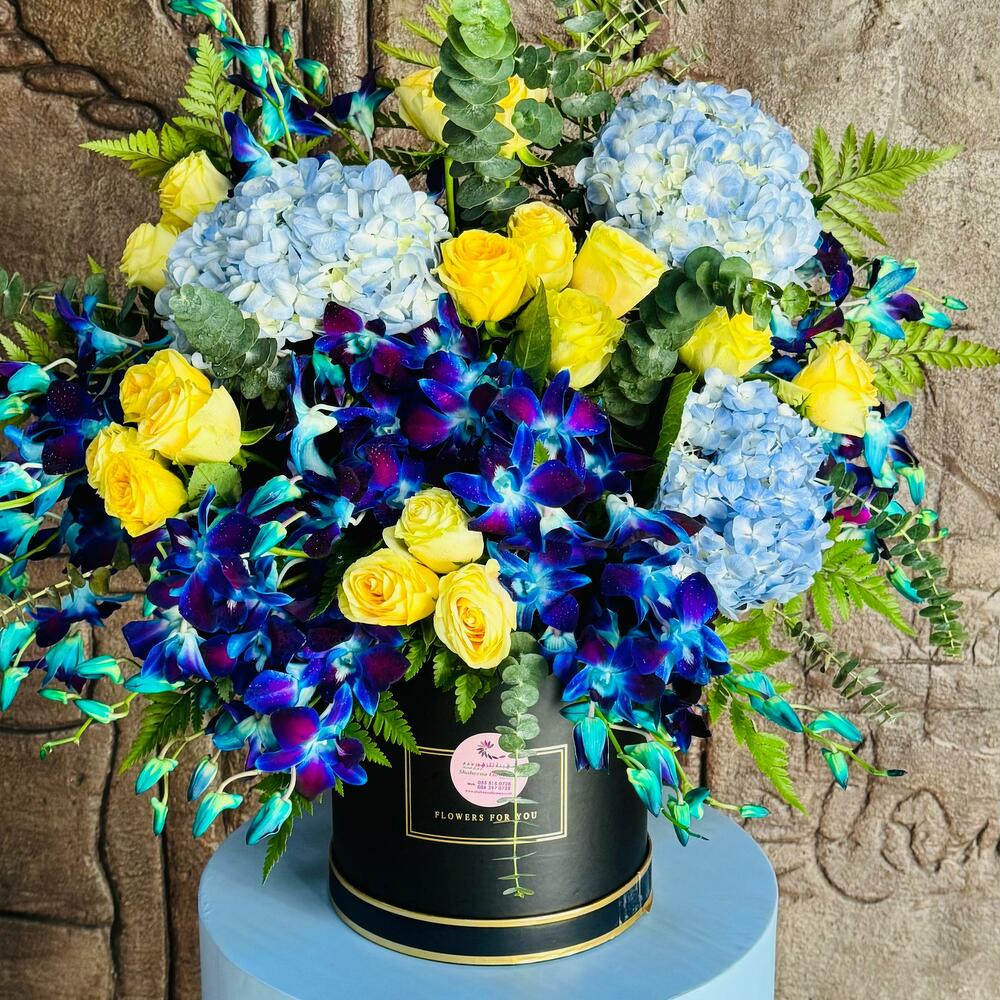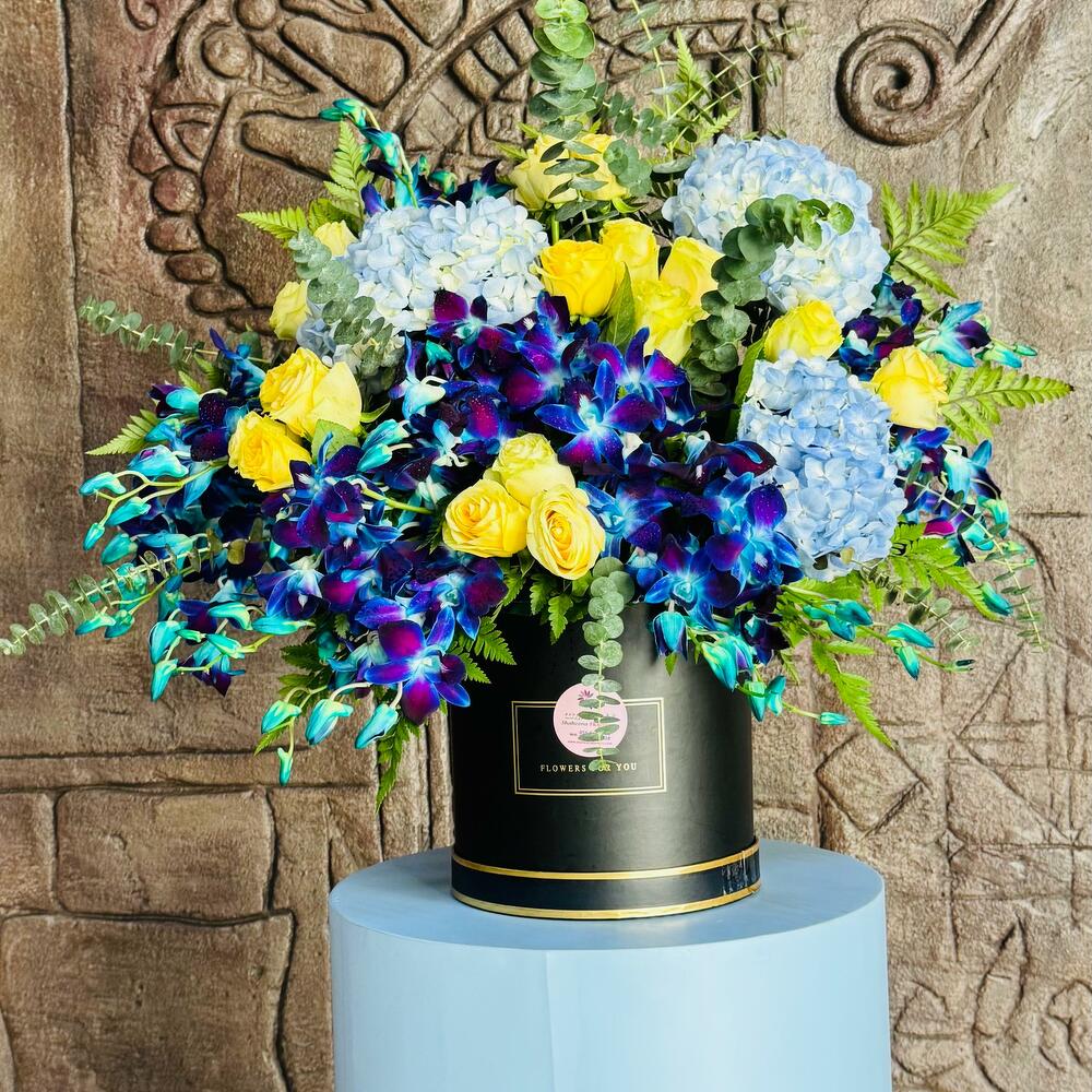Cette élégante composition unilatérale présente 3 hortensias bleus immaculés, 20 roses citron, 20 orchidées bleu vif, le tout magnifiquement agencé avec des garnitures vertes fraîches dans une boîte ronde noire. La combinaison du bleu, du citron apaisant et du bleu crée un bouquet éblouissant et sophistiqué, parfait pour toute occasion spéciale.