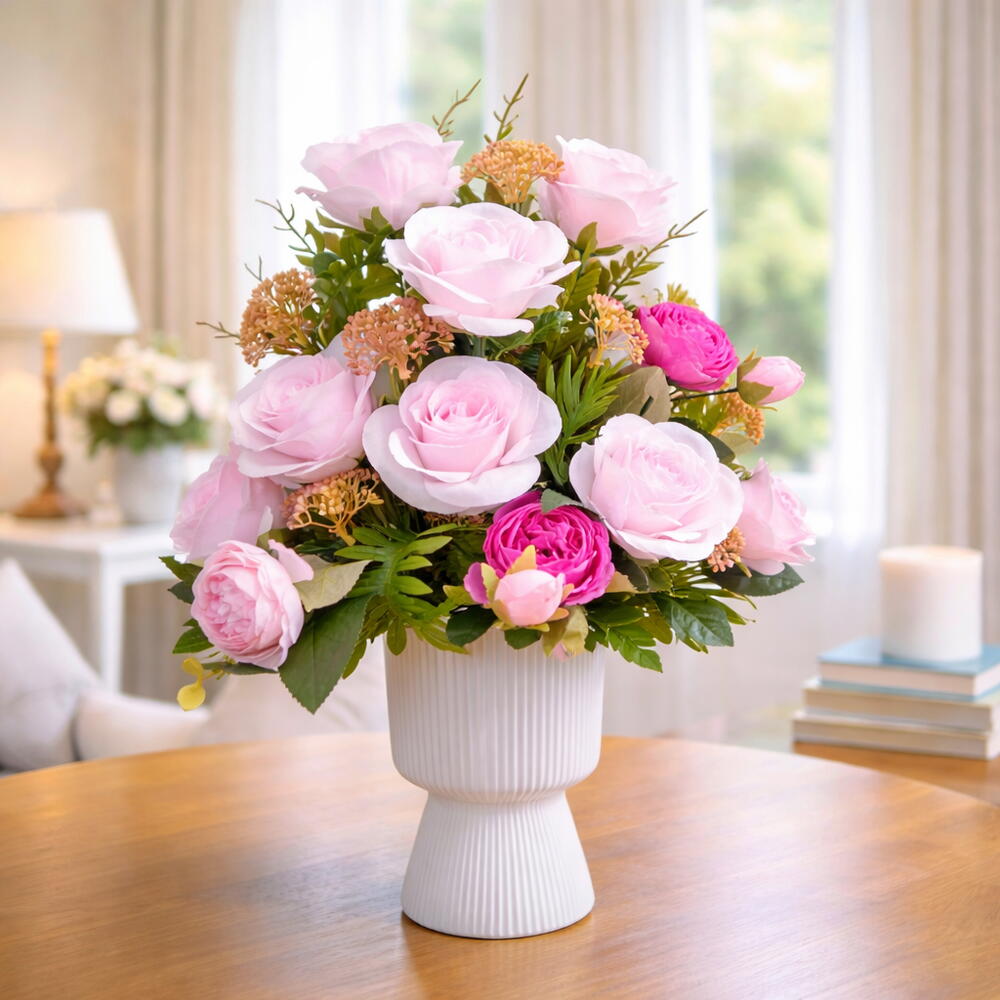 Arrangement artificiel en vase sur piédestal de roses rose poudré