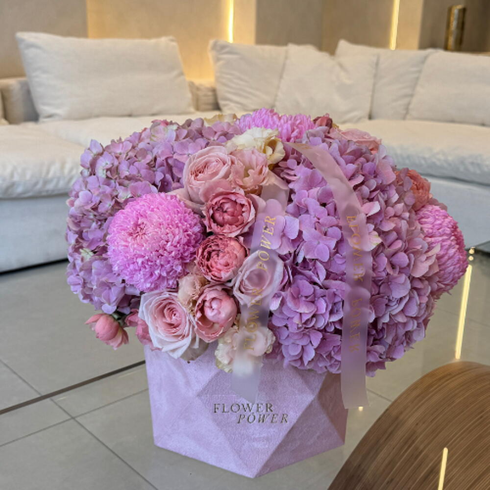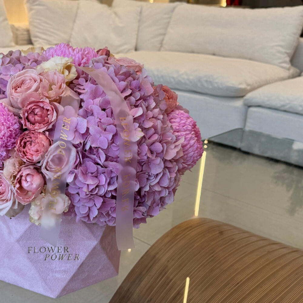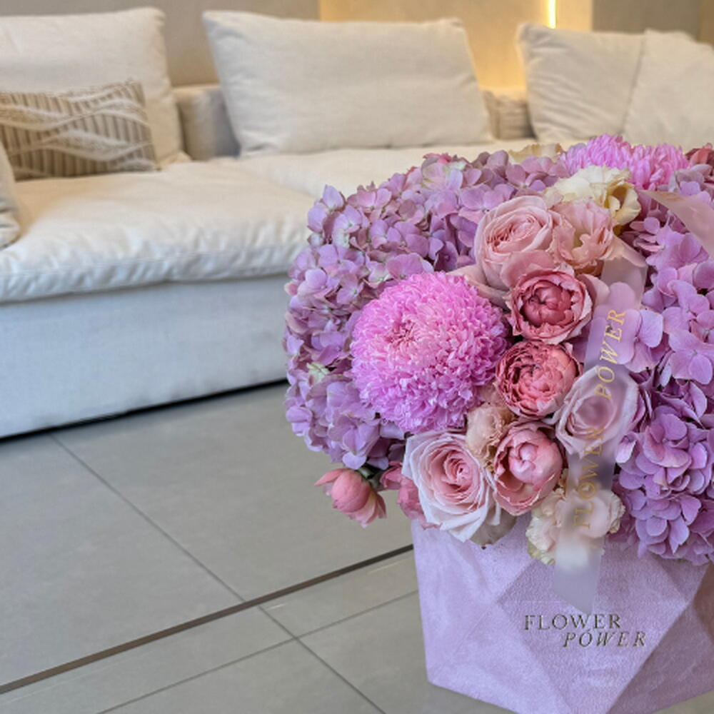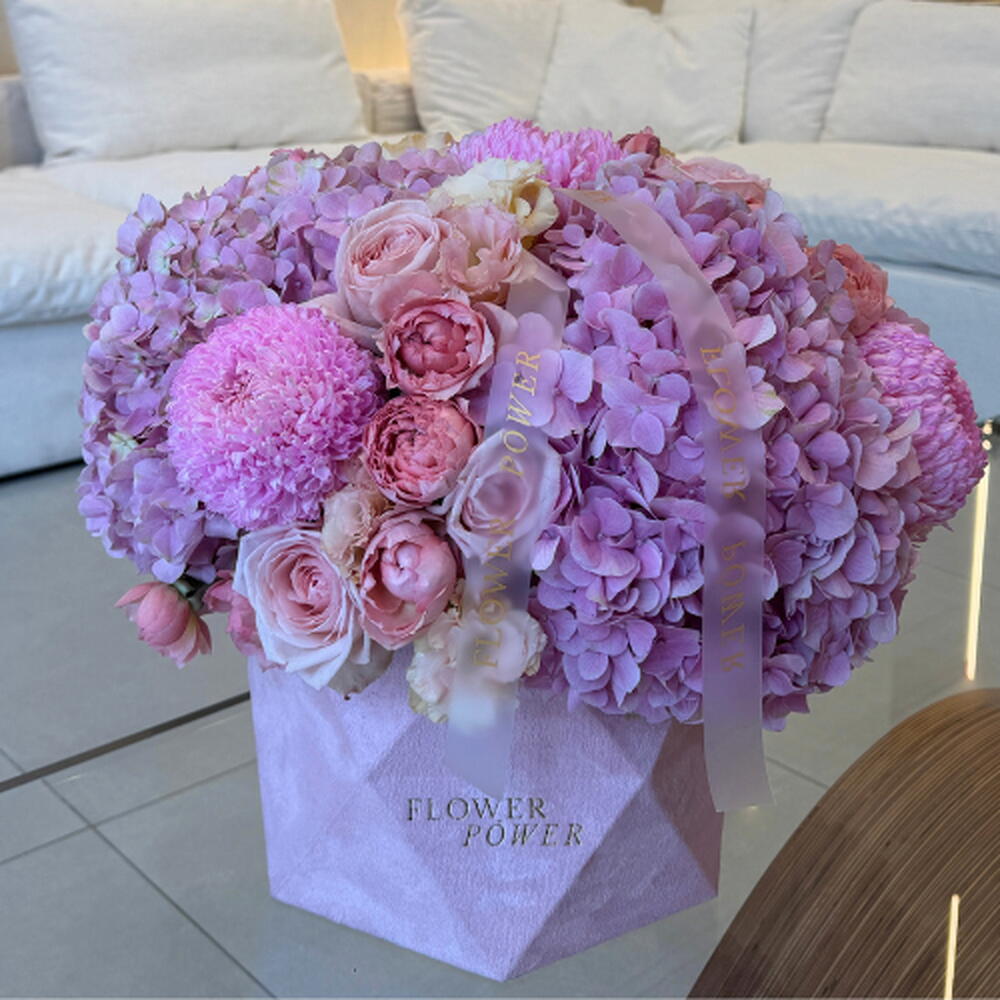 Laissez-vous envoûter par une douce mélodie de teintes avec notre composition florale Blush Symphony. Présentée dans un élégant coffret rose signature, cette création harmonise la générosité des hortensias roses avec la grâce intemporelle des roses roses et la gaieté des chrysanthèmes ping-pong. Véritable chef-d'œuvre de textures et de nuances, c'est un choix raffiné pour un anniversaire, une déclaration d'amour ou tout simplement pour égayer la journée d'un être cher d'une touche de grâce.