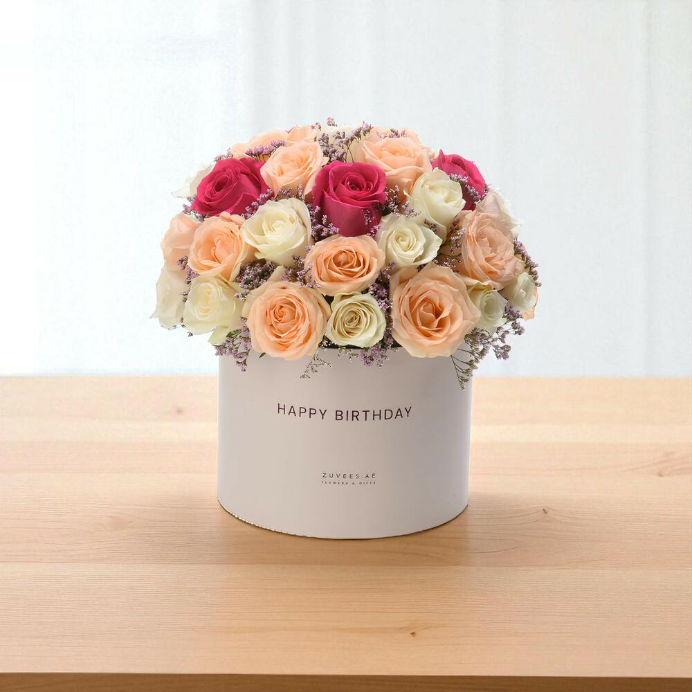 Célébrez un jour spécial avec la beauté intemporelle de la Boîte d'Anniversaire Jardin des Roses Rougissantes — une composition joyeuse de fleurs délicates et éclatantes conçue pour rendre les anniversaires vraiment mémorables.