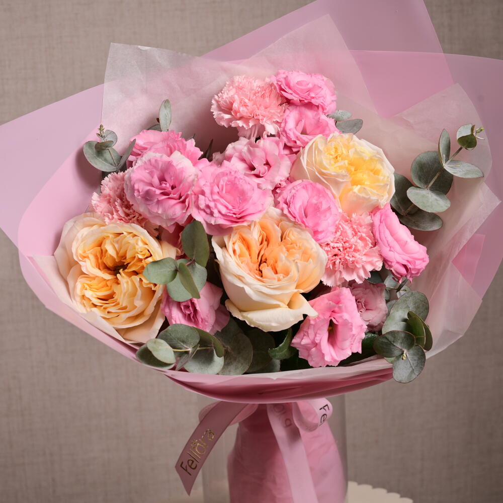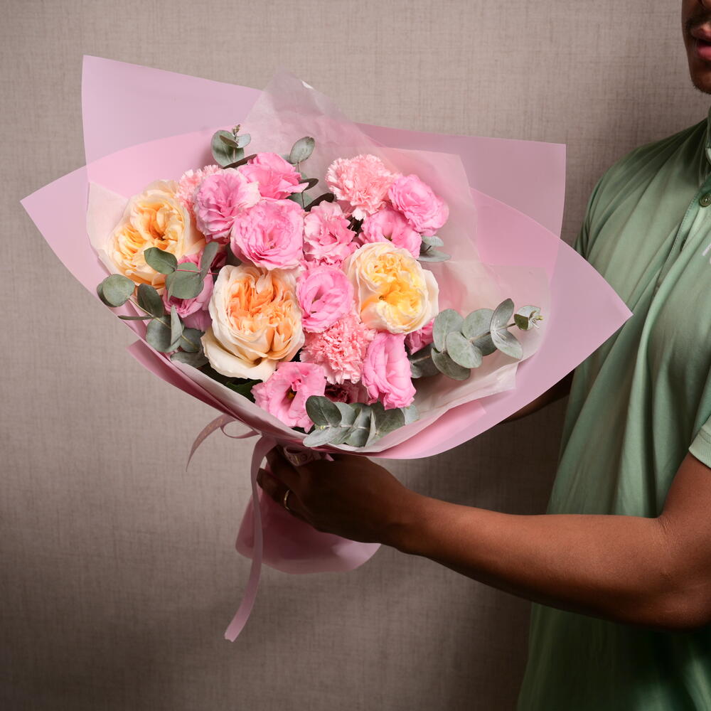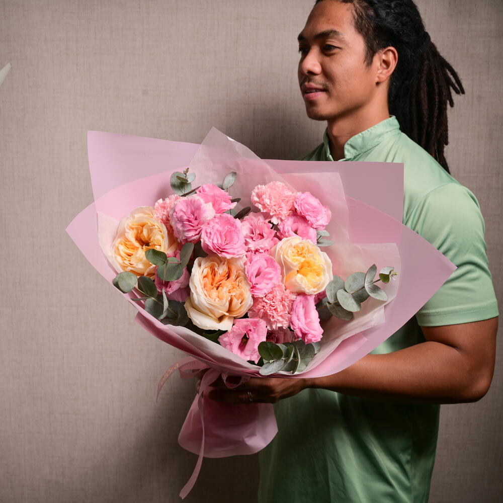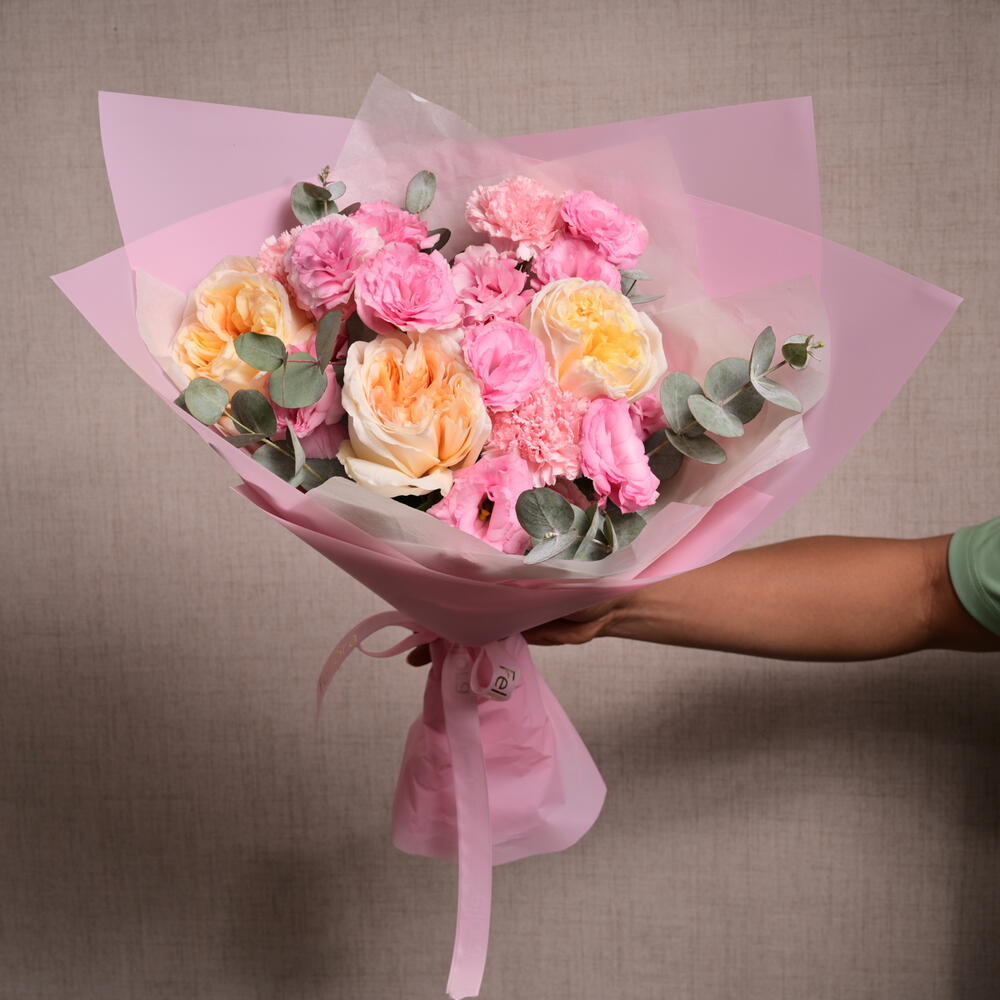 Laissez-vous séduire par le charme de notre Bohemian Pink de Fellora Flower Boutique. Ce beau bouquet comprend 3 roses pêche premium, 3 œillets roses, 3 lisianthus roses et 2 feuilles d'eucalyptus, enveloppé délicatement dans 4 feuilles de papier d'emballage rose et 2 feuilles de papier de soie rose. Les teintes douces et romantiques et l'élégance naturelle de cet arrangement en font le cadeau parfait pour toutes les occasions, apportant une touche de beauté bohème à vos célébrations.