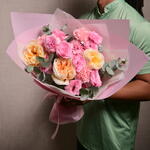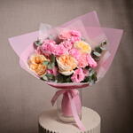 Ribbon - 1 pce Eucalyptus - 2 pce pink carnation - 3 pce lisianthus rose - 3 pce roses pêche premium - 3 pce papier de soie rose 2 - 2 pce papier cadeau rose - 4 pce