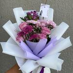 Plongez dans la délicate beauté de notre arrangement Florists Special. Ce mélange exquis comprend deux chrysanthèmes roses, un chrysanthème pourpre royal, deux tiges de limonium rose charmant, quatre roses rose pâle et une astomeriya immanquable d'un violet radiant. Parfaitement conçu pour ceux qui recherchent une touche d'élégance et de sophistication, ce bouquet crée une déclaration saisissante. D'une beauté naturelle, il constitue un cadeau idéal pour toute occasion — ou simplement un élégant centre de table pour illuminer n'importe quel espace.