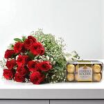 Red rose - 12 pce Gypsophila - 10 pce Feuilles vertes - 5 pce boîte Ferrero Rocher - 1 pce