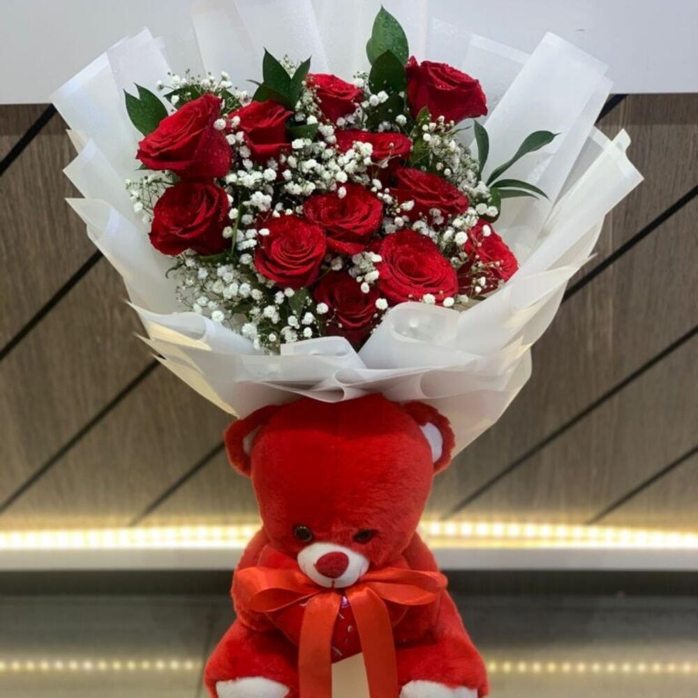 Red rose - 12 pce Ruscus - 5 pce nounours - 1 pce gypse - 5 pce