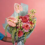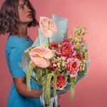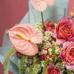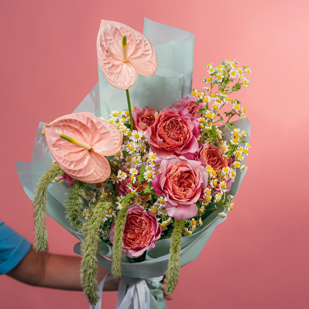 Un charmant bouquet composé de roses classiques, de délicates camomilles, d'anthuriums exotiques et de feuillages décoratifs luxuriants.