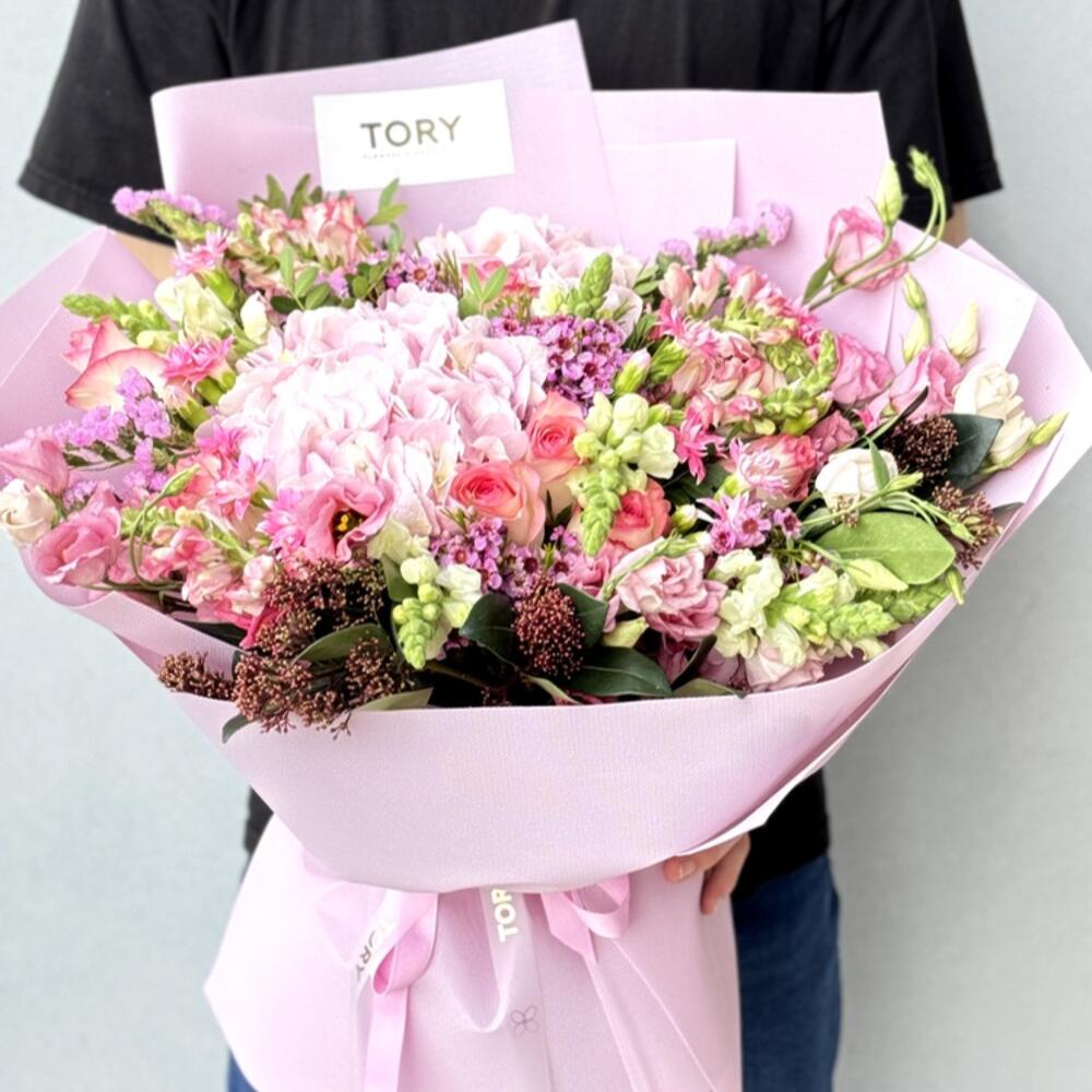Hydrangea - 2 pce Pistacia - 3 pce Lisianthus - 7 pce spray d'œillet - 7 pce chamelacium - 5 pce rose Jumilia - 10 pce mélange d'antirrinum (muflier) - 10 pce import statique - 5 pce papier d'emballage pour fleurs - 1 pce mélange de skimmia - 4 pce