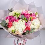 Eucalyptus - 4 pce Spray rose - 5 pce Pink rose - 8 pce pink carnation - 5 pce white hydrangea - 3 pce lisianthus (nuances mélangées) - 4 pce